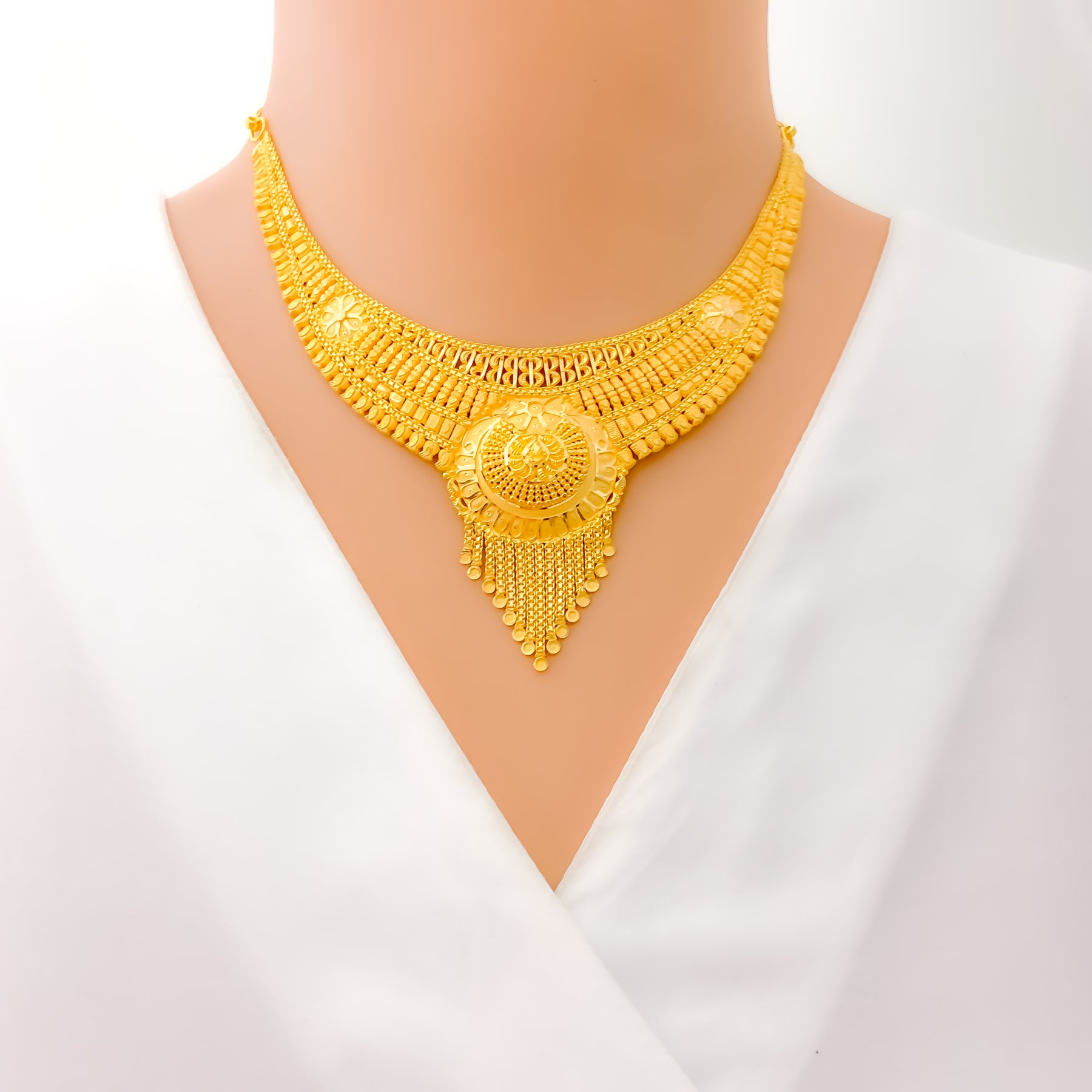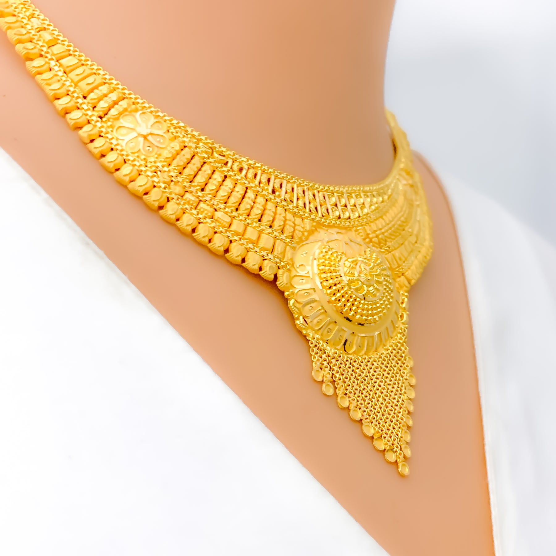 Refined and radiant, this 22k yellow gold necklace set weighs 30.2 grams and showcases a 15" graduating design that tapers elegantly along the neckline. It features 1" adjustable links, a secure hook lock, and matching 1.5" screw-back earrings. A glistening, upscale ensemble that delivers timeless sophistication and luxurious appeal.