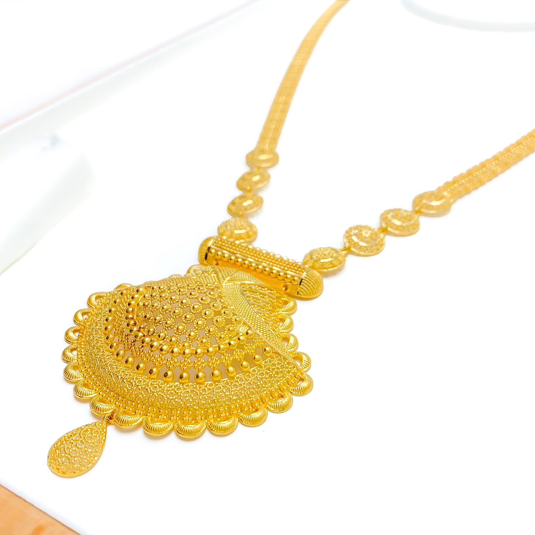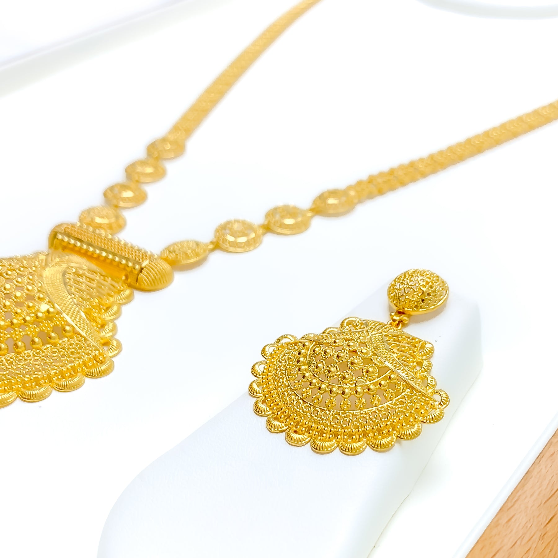 Elegantly intricate, this 22k yellow gold necklace set weighs 55.9 grams and showcases a 26" length with a detailed 3.2" floral filigree drop. Featuring 2.0" adjustable links, a secure hook lock, and 1.75" screw-back earrings, it embodies artistic refinement. An impressive ensemble ideal for special occasions and traditional elegance.