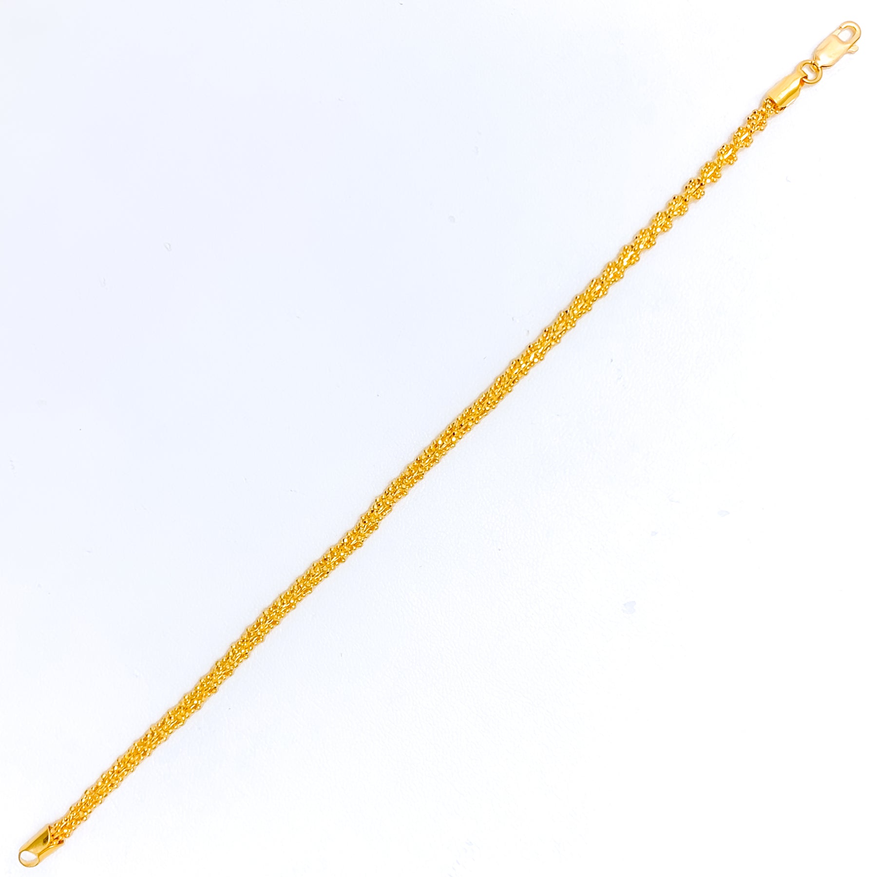 This exquisite 22k gold bracelet, weighing 7.7 grams, showcases a refined design that radiates elegance and charm. The polished yellow gold finish enhances its sophisticated craftsmanship, creating a timeless yet versatile appeal. Measuring 7.6 inches in length, it ensures a comfortable and secure fit, fastened with a durable lobster lock for reliability. A seamless blend of classic beauty and modern allure, this bracelet is a stunning addition to any fine jewelry collection, perfect for both everyday wear and special occasions.