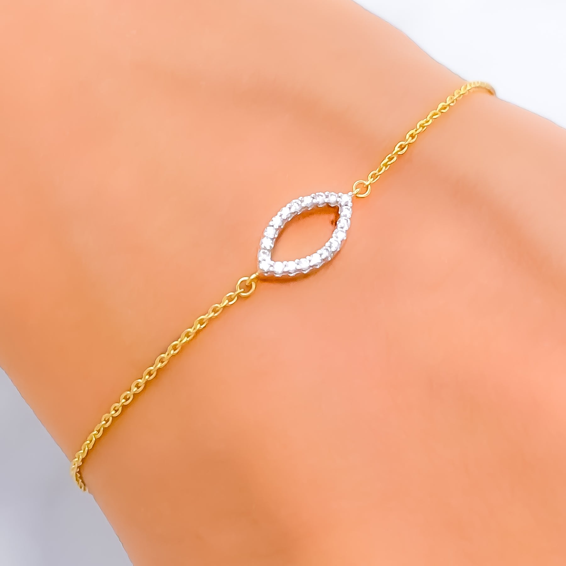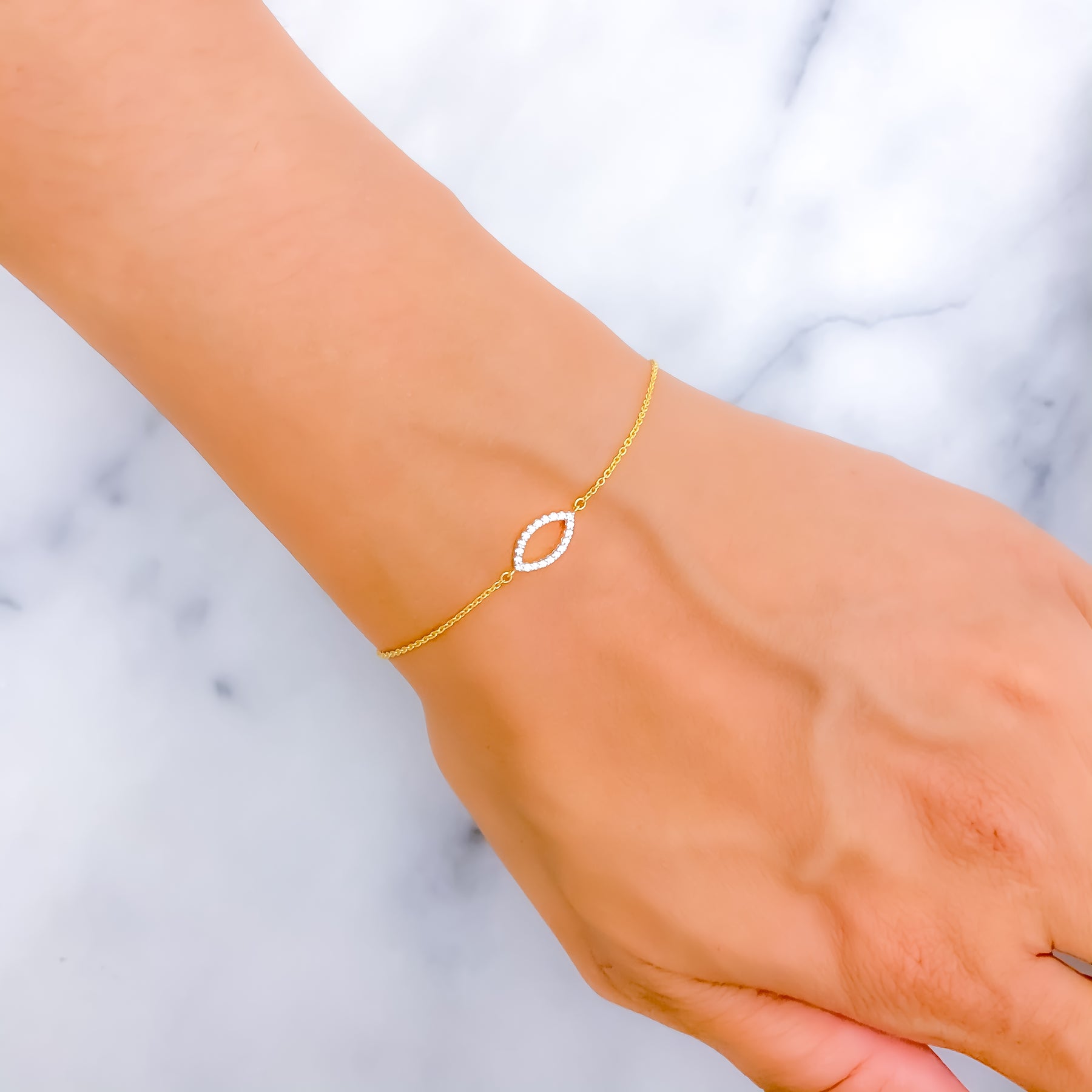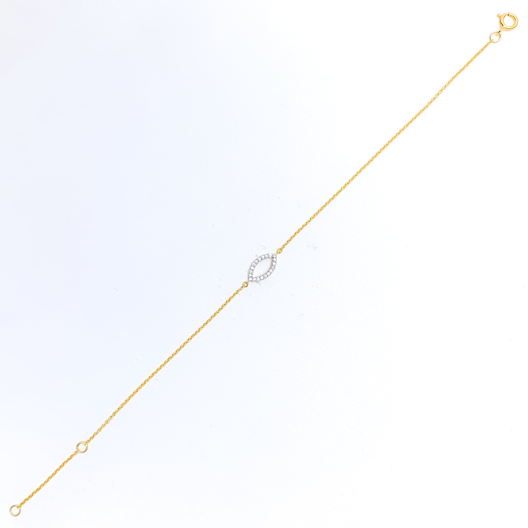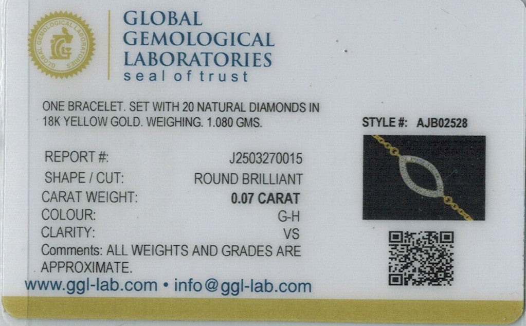 Delicately crafted, this 18k yellow gold bracelet weighs 1.08 grams and features a marquise-shaped design accented by a 0.07ct round brilliant diamond. With G-H color, VS clarity, and GGL certification, it sparkles with subtle elegance. Measuring 7.5" and secured with a lobster ring lock, it’s a charming blend of grace and everyday style.