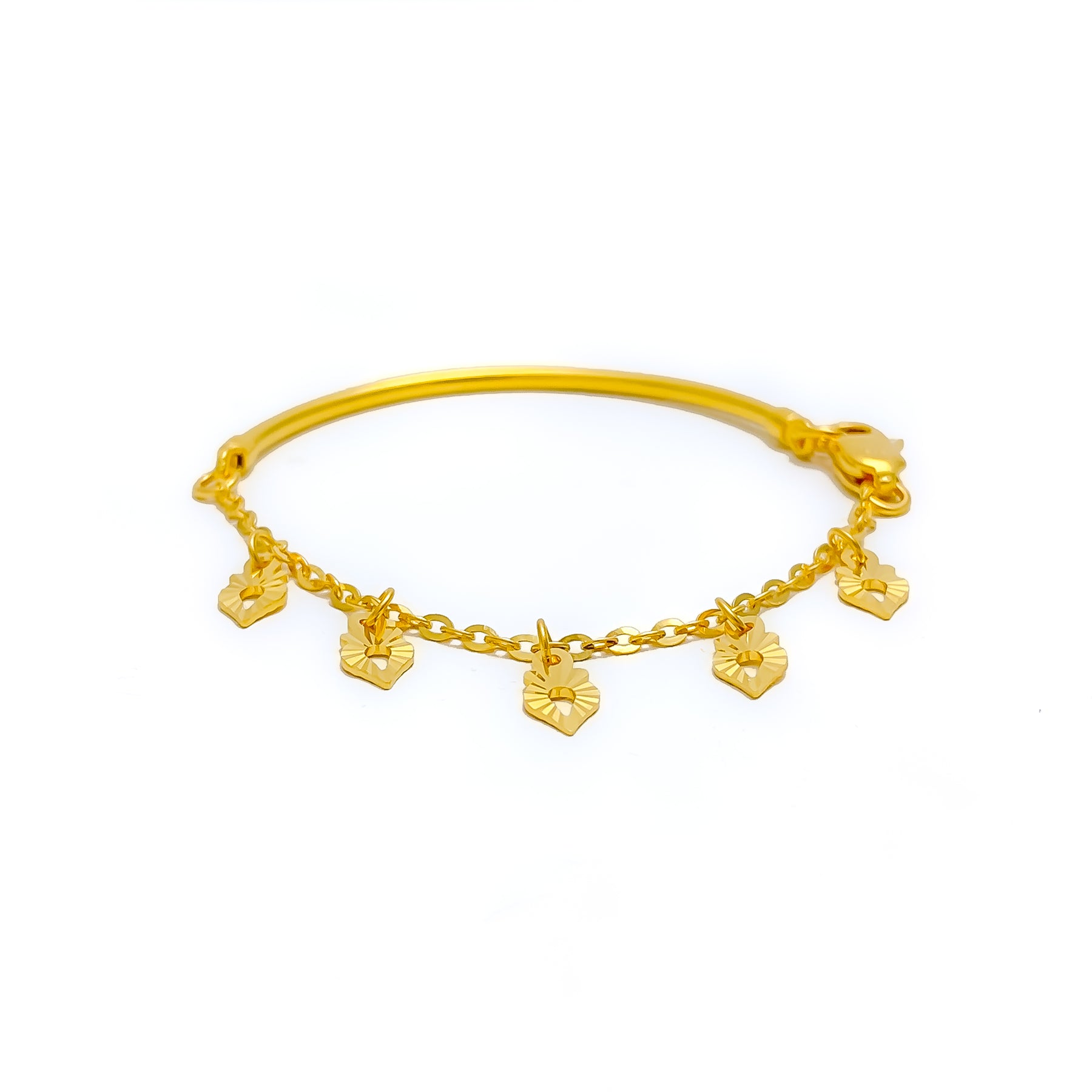 Delicately crafted in 22k yellow gold and weighing 3.3 grams, this baby bracelet measures 4.5 inches in length, offering a snug and comfortable fit for little wrists. The polished finish adds a soft, elegant glow, while the lobster lock ensures both safety and ease of wear. Designed with sweet sophistication, this piece is perfect as a memorable gift or keepsake. Its graceful design and fine detail make it a timeless treasure for celebrating precious early moments.