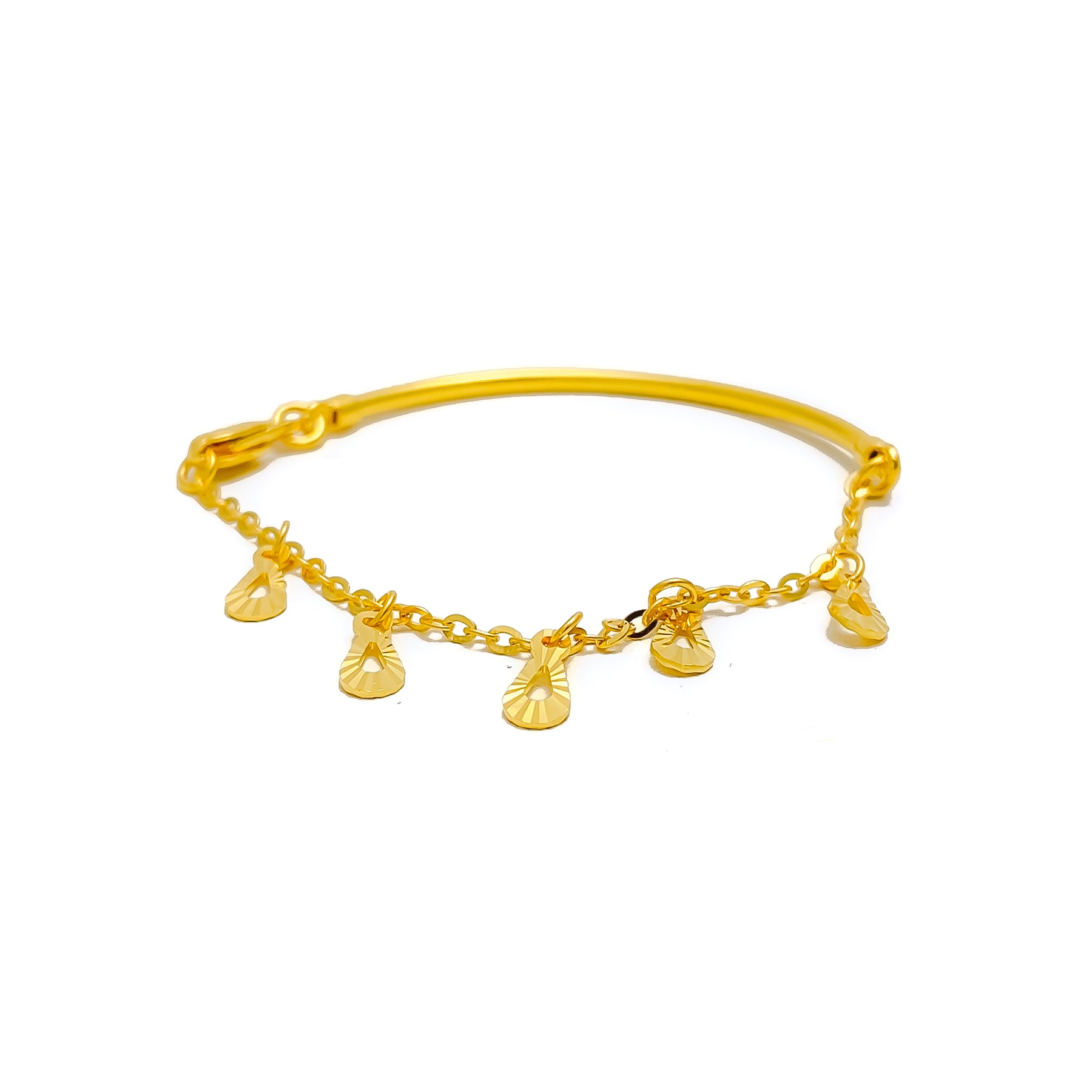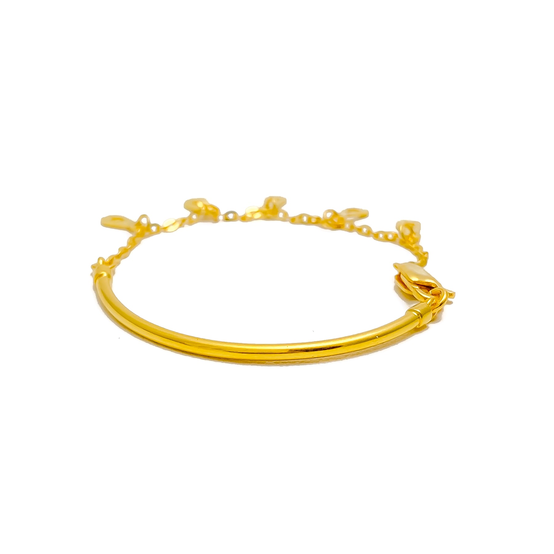 Crafted in gleaming 22k yellow gold and weighing 3.2 grams, this baby bracelet measures 4.6 inches in length, offering a snug and stylish fit for tiny wrists. The polished finish enhances its radiant charm, while the lobster lock ensures both safety and ease of use. With its playful yet refined design, this bracelet makes a thoughtful gift or precious keepsake. Perfect for modern little ones, it captures timeless elegance with a fresh, fashionable twist for early memories.