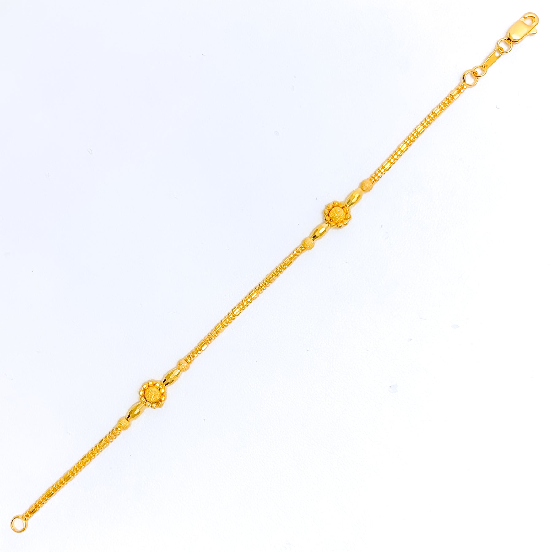 Delicately styled, this 22K gold bracelet showcases an elegant floral motif that radiates soft femininity. Weighing 6.4 grams, its slender form and polished yellow gold finish add charm to everyday wear. The 7.6" length offers a comfortable fit for most wrists. A secure lobster lock ensures effortless, reliable closure.