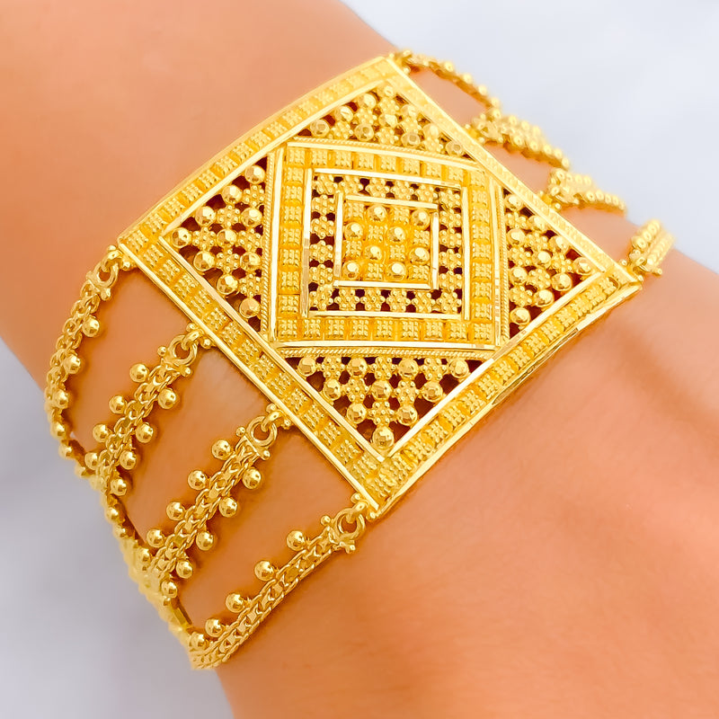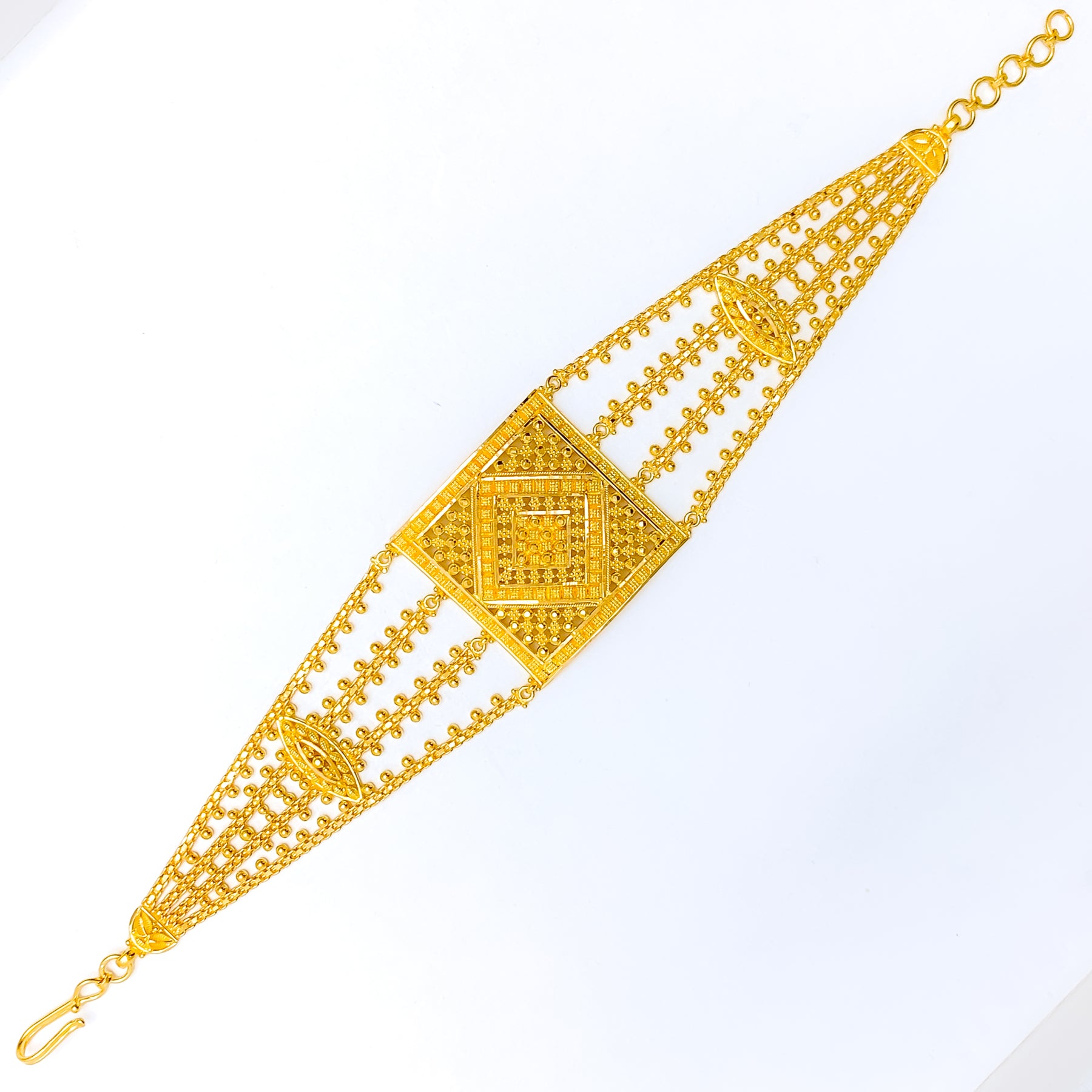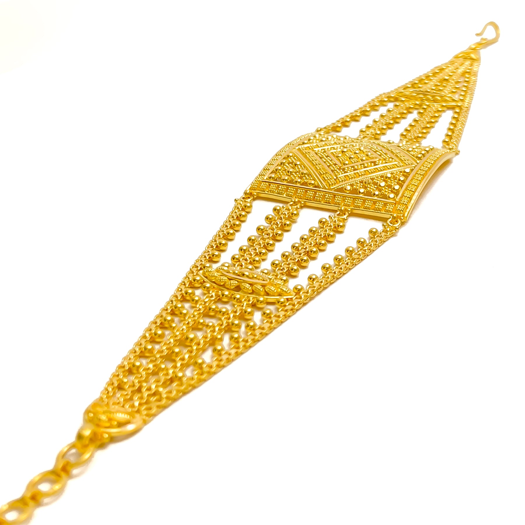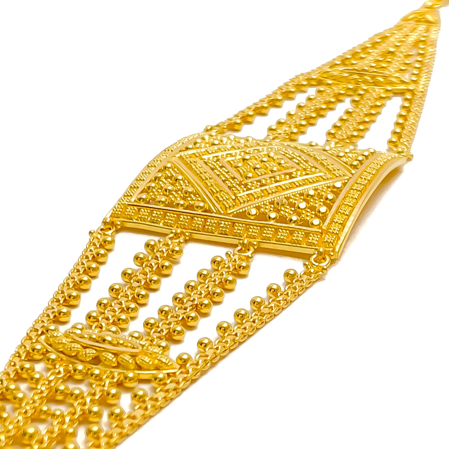 Bold yet refined, this 22.9-gram bracelet in 22k yellow gold features a sleek, iconic design that makes an effortless statement. Measuring 8.2 inches with 0.9-inch adjustable links, it secures with a classic hook lock. A timeless piece that blends clean lines with unmistakable elegance.