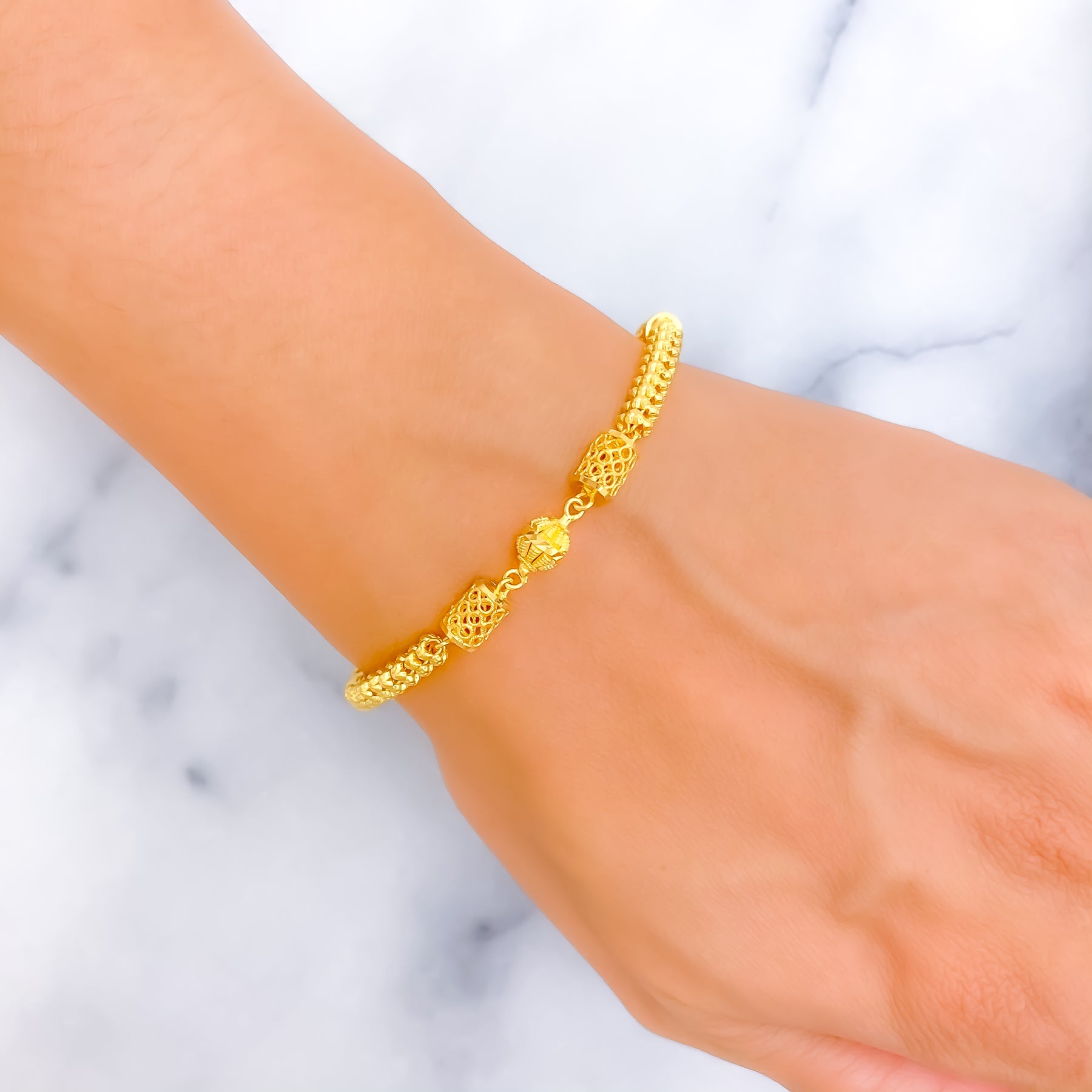 Crafted in 22k yellow gold with a weight of 9.5 grams, this exquisite bracelet radiates timeless luxury. The polished finish enriches its adorned design, bringing luminous brilliance to its refined silhouette. Measuring 7.75 inches in length with 0.75-inch adjustable links, it ensures a comfortable fit. Completed with a secure hook lock, it is a versatile jewel for festive and elegant occasions.