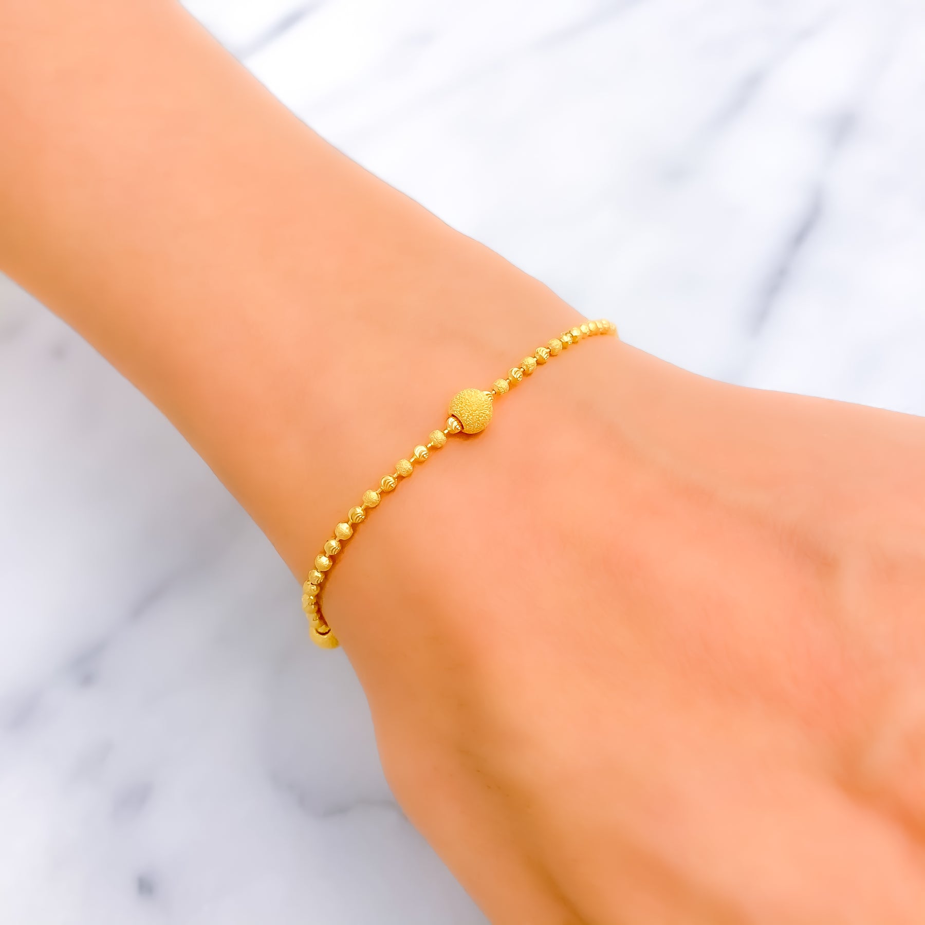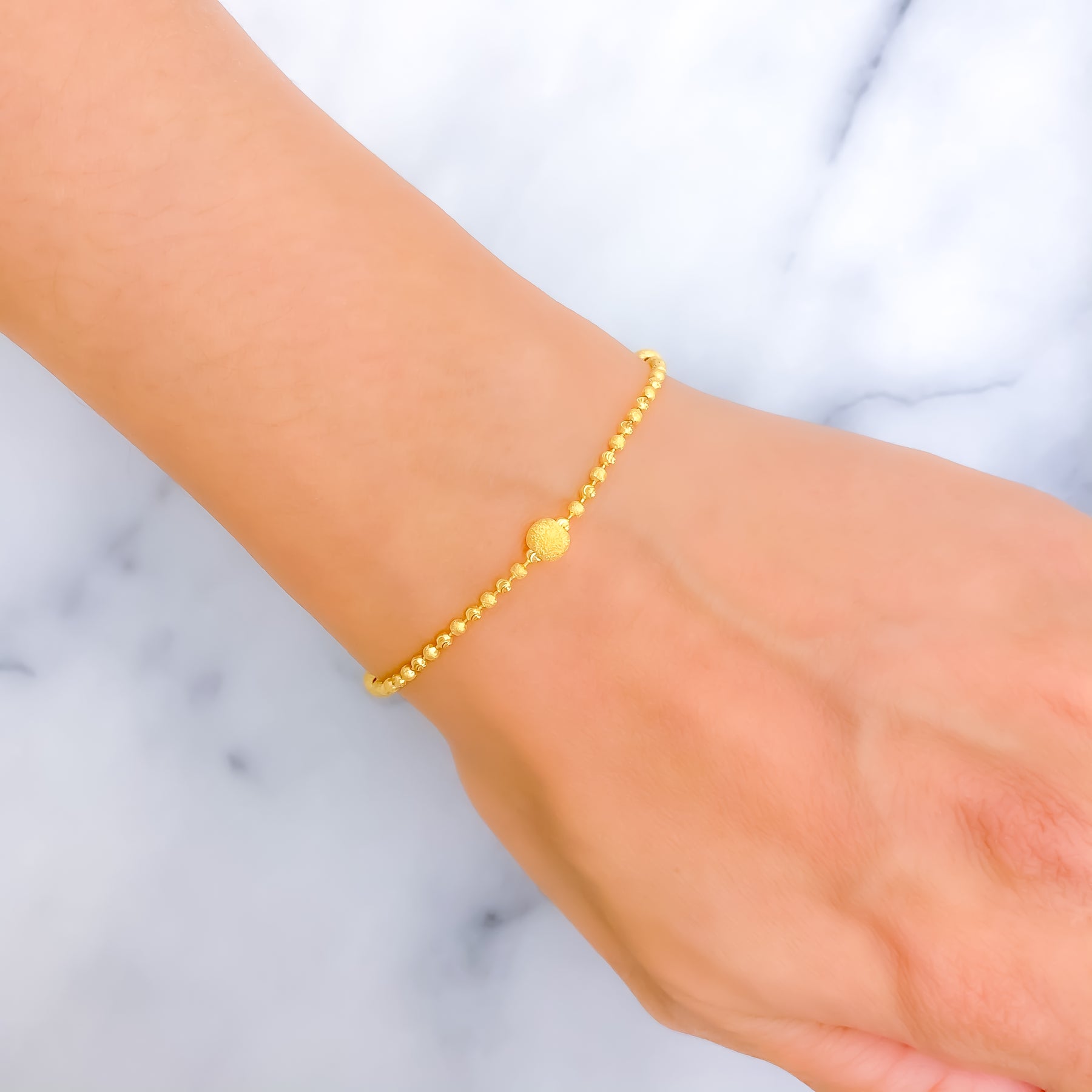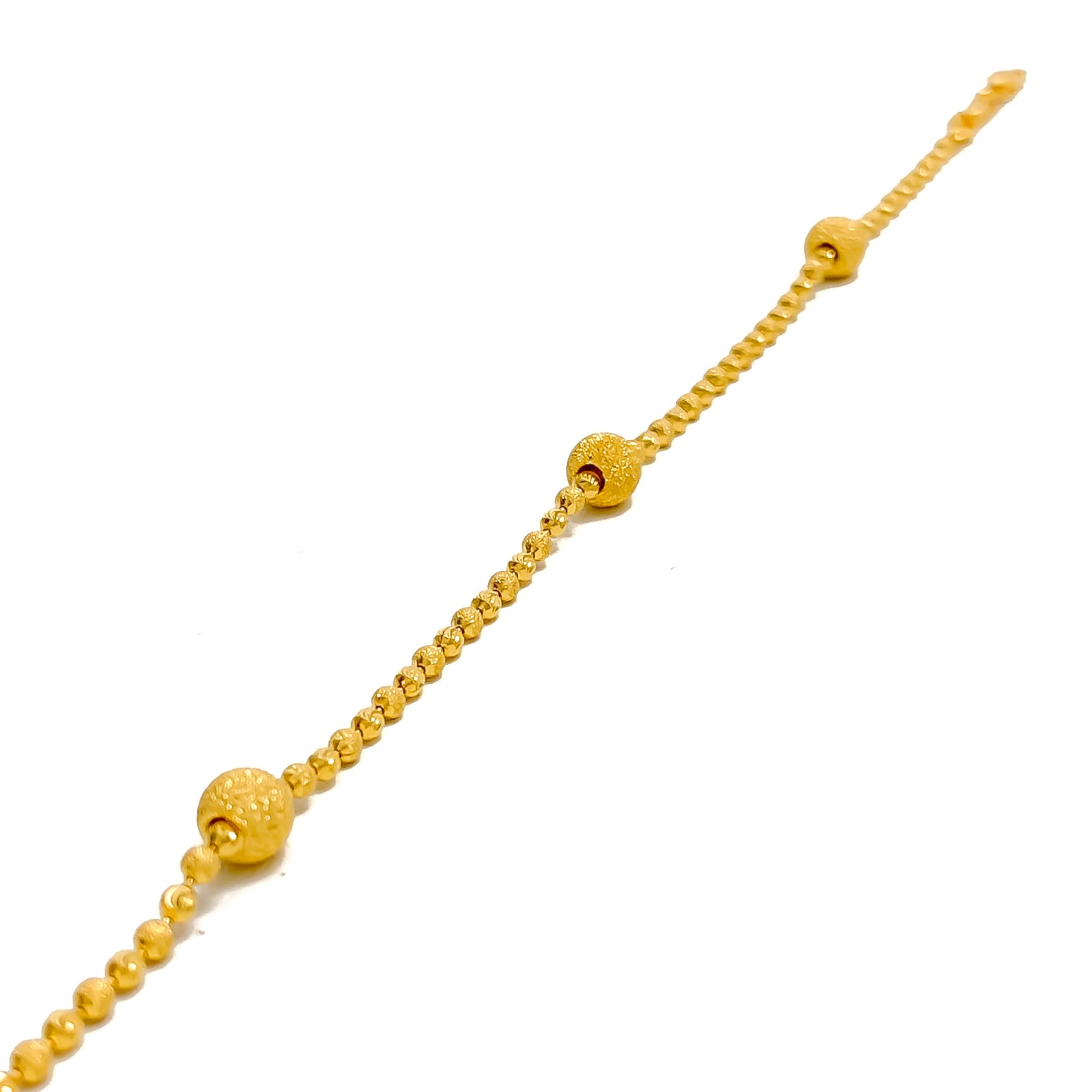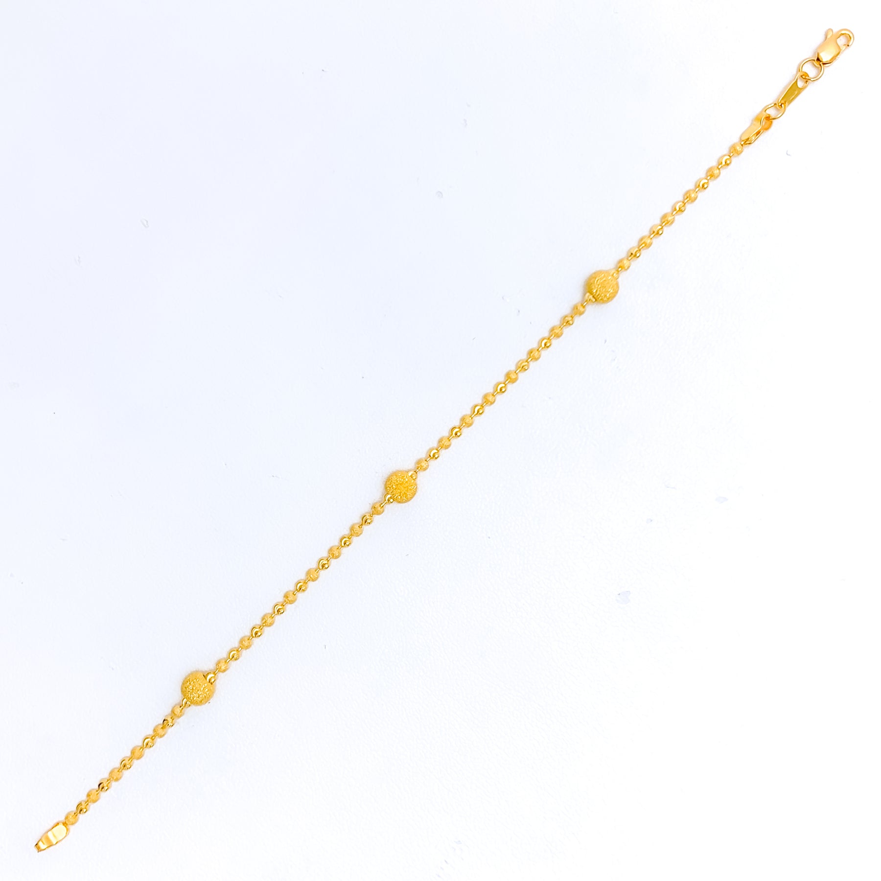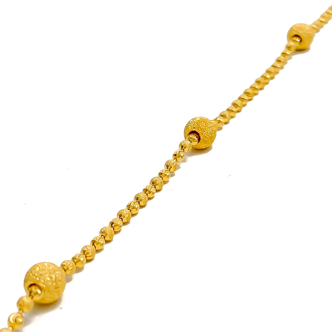Exquisitely designed, this 22K gold bracelet radiates warmth and luxury with its luminous yellow gold finish and refined 4.7-gram weight. The 7.1" length offers an elegant drape, ideal for both daily sophistication and special occasions. Its delicate charm enhances any ensemble effortlessly. A lobster lock ensures a secure and graceful wear.