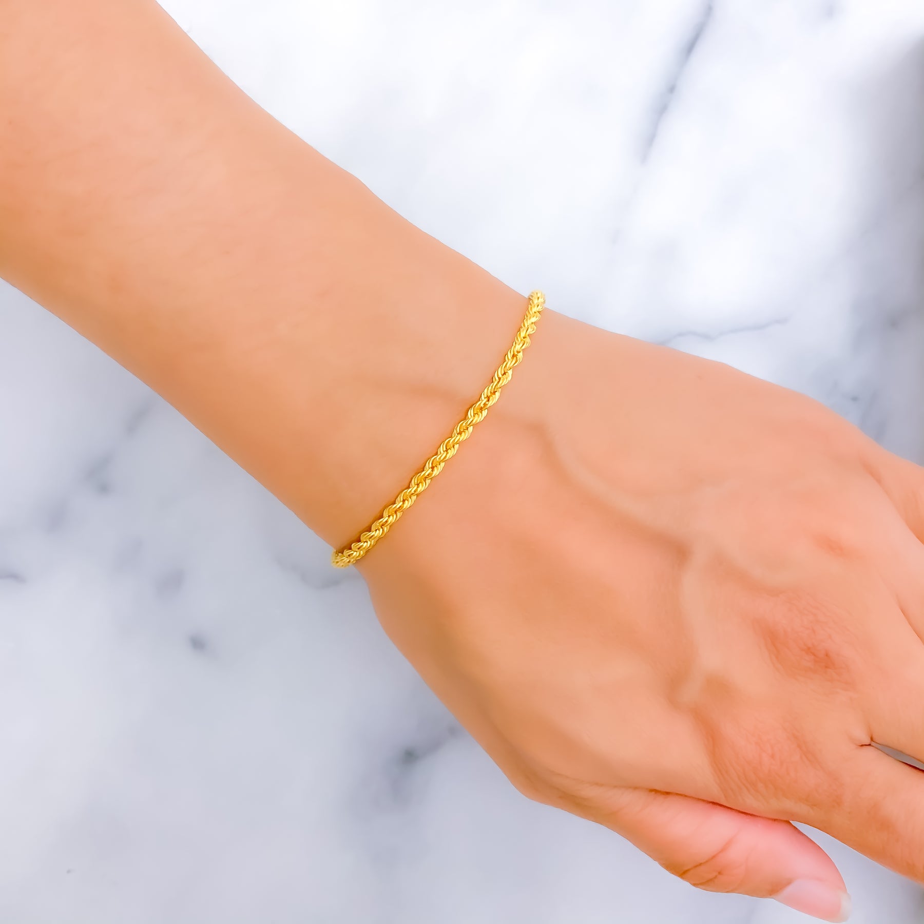 Crafted from 22k yellow gold, this stylish bracelet weighs 3.4 grams, combining lightweight ease with radiant allure. Its 7.1-inch length ensures a comfortable fit while maintaining refined sophistication. The polished finish enhances its jazzy brilliance, perfect for both daily wear and festive occasions. Completed with a lobster lock, it offers elegance with secure durability.