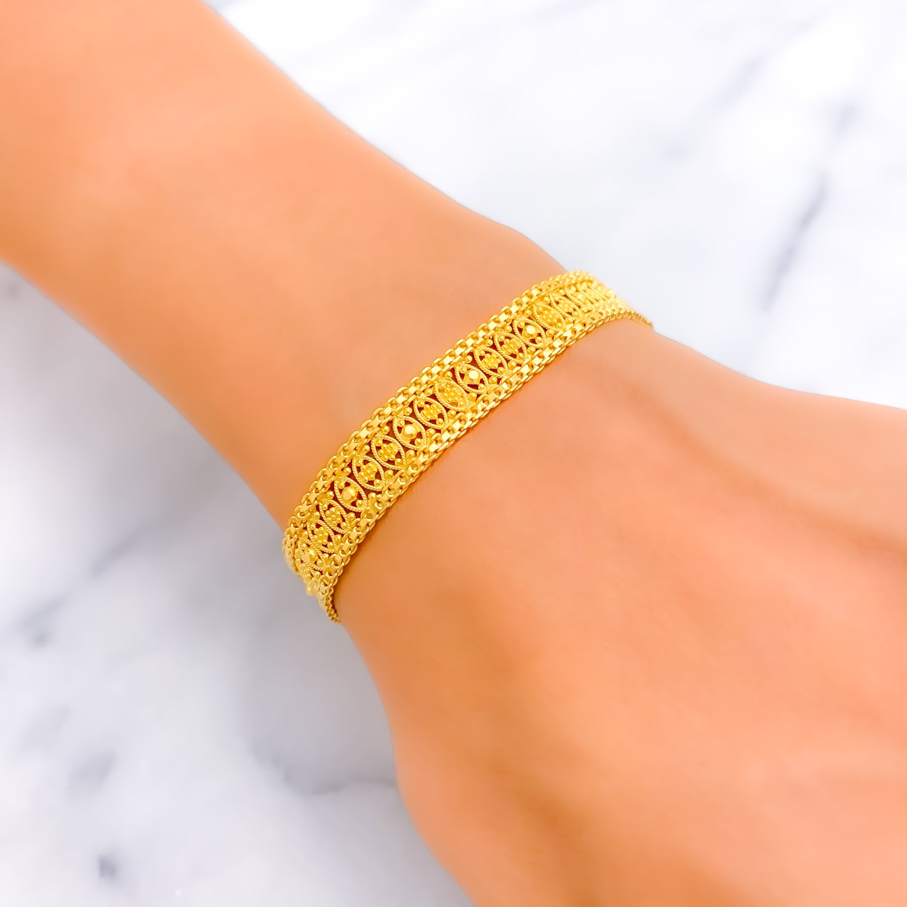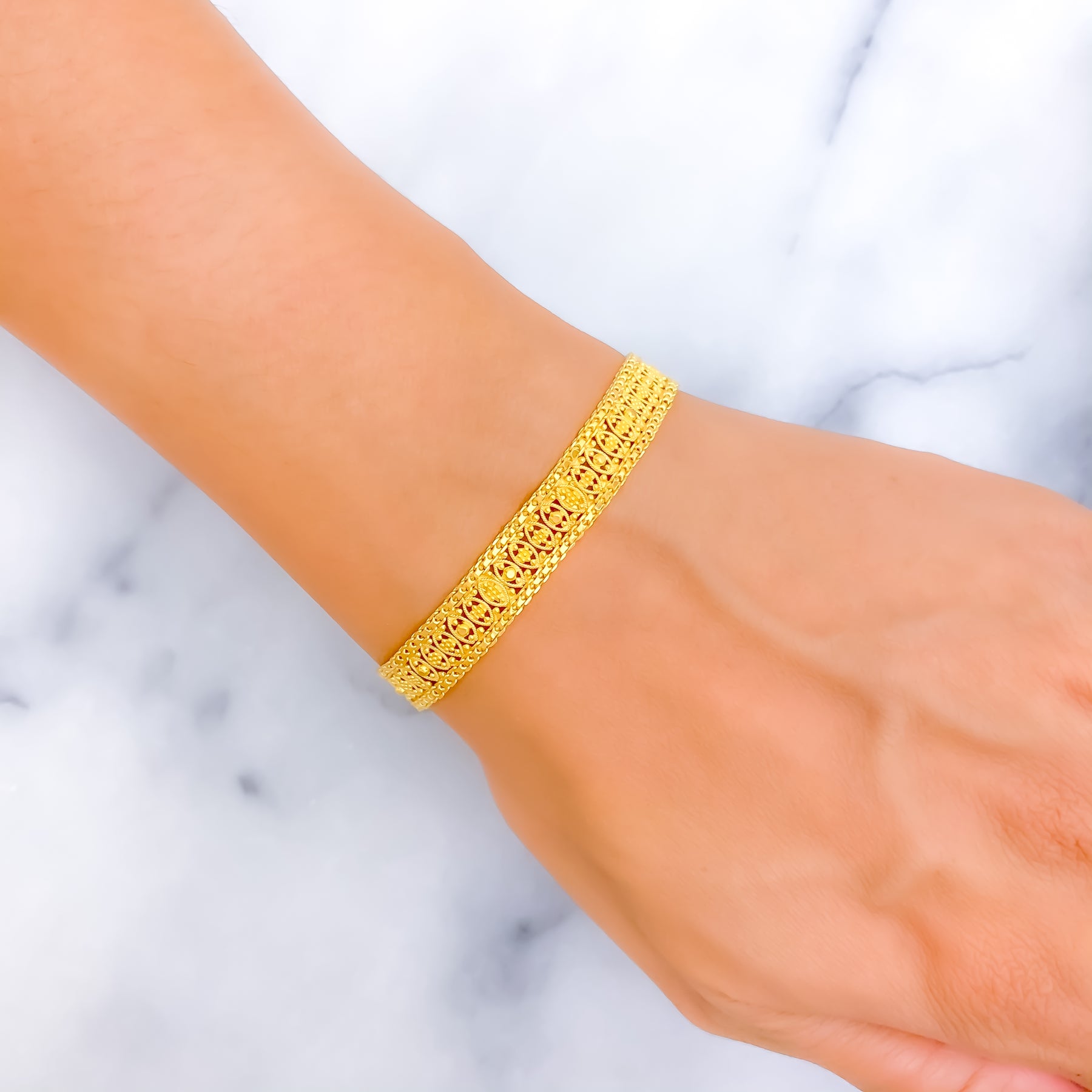 Crafted in 22k yellow gold with a weight of 10.2 grams, this refined bracelet radiates graceful sophistication. The polished finish enhances its sleek design, offering a luminous balance of modern style and timeless elegance. Measuring 7.75 inches in length with 1.25-inch adjustable links, it provides a tailored fit. Completed with a secure hook lock, it is a versatile jewel for both daily wear and festive occasions.