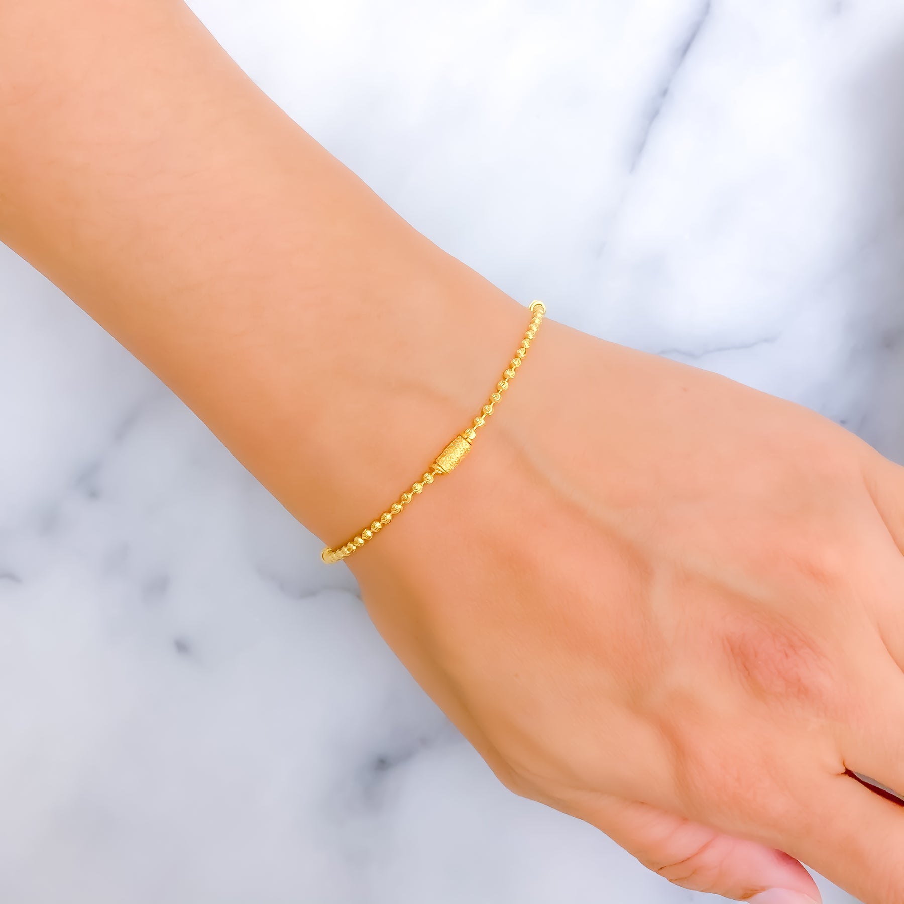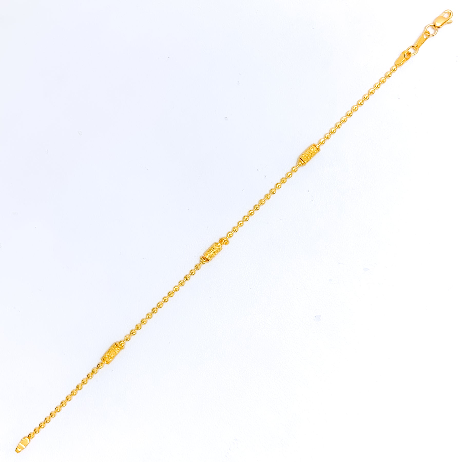 Graceful in form and finish, this 22K gold bracelet offers a refined touch with its slim 4.9-gram design and polished yellow gold sheen. Measuring 7.2" in length, it provides a delicate yet comfortable fit for everyday wear. The understated elegance makes it versatile for layering or solo styling. A secure lobster lock completes this timeless accessory.