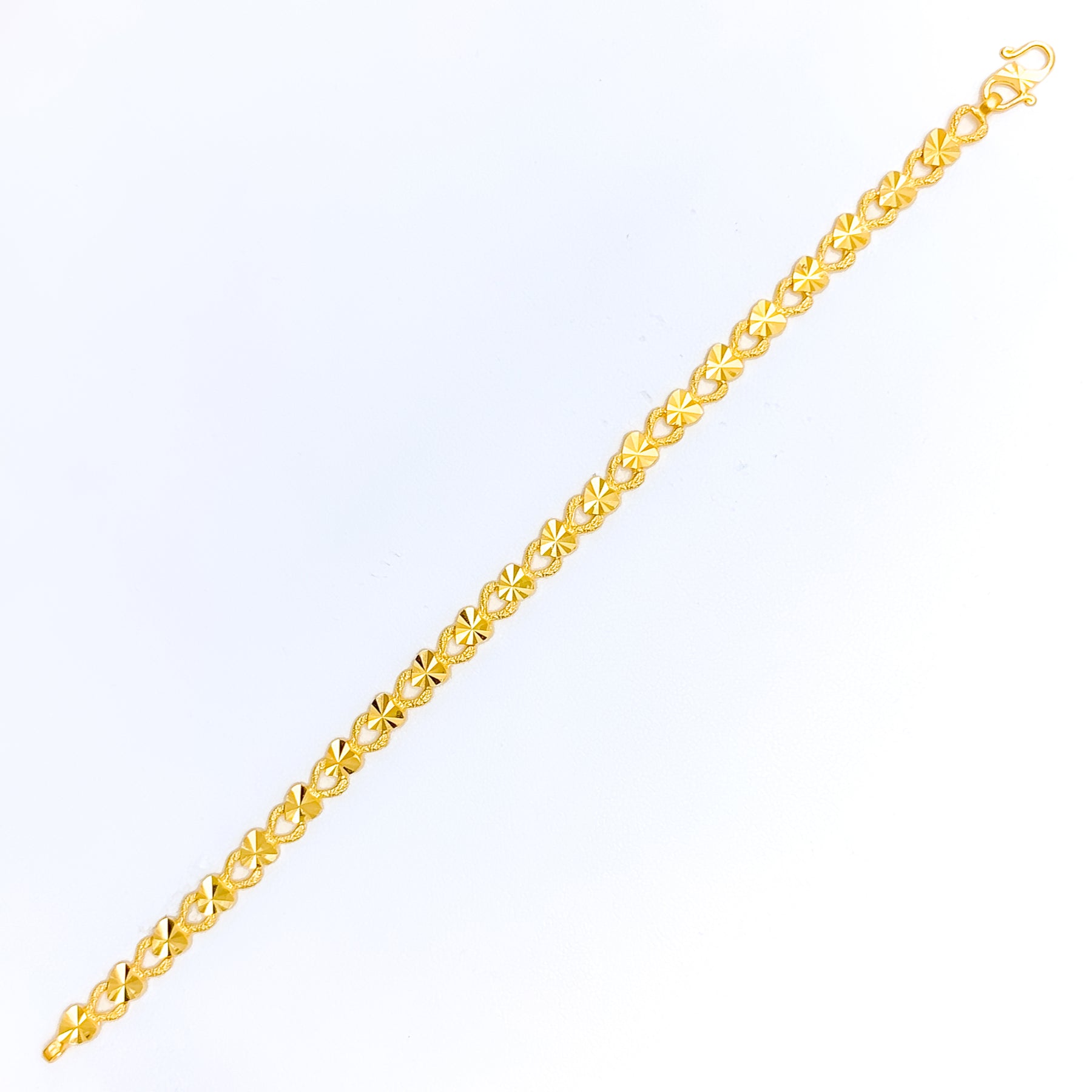 Infused with artistic brilliance, this 22k gold bracelet weighs 10.0 grams and features an ornamental design that sparkles with every subtle movement. Measuring 7.5 inches and secured by a classic S lock, it offers a comfortable and elegant fit for daily wear or festive occasions. The radiant yellow gold finish enhances its lively twinkling effect, making it an eye-catching piece for those who appreciate intricate craftsmanship and timeless charm. Perfect for adding a graceful, luminous touch to any jewelry collection.