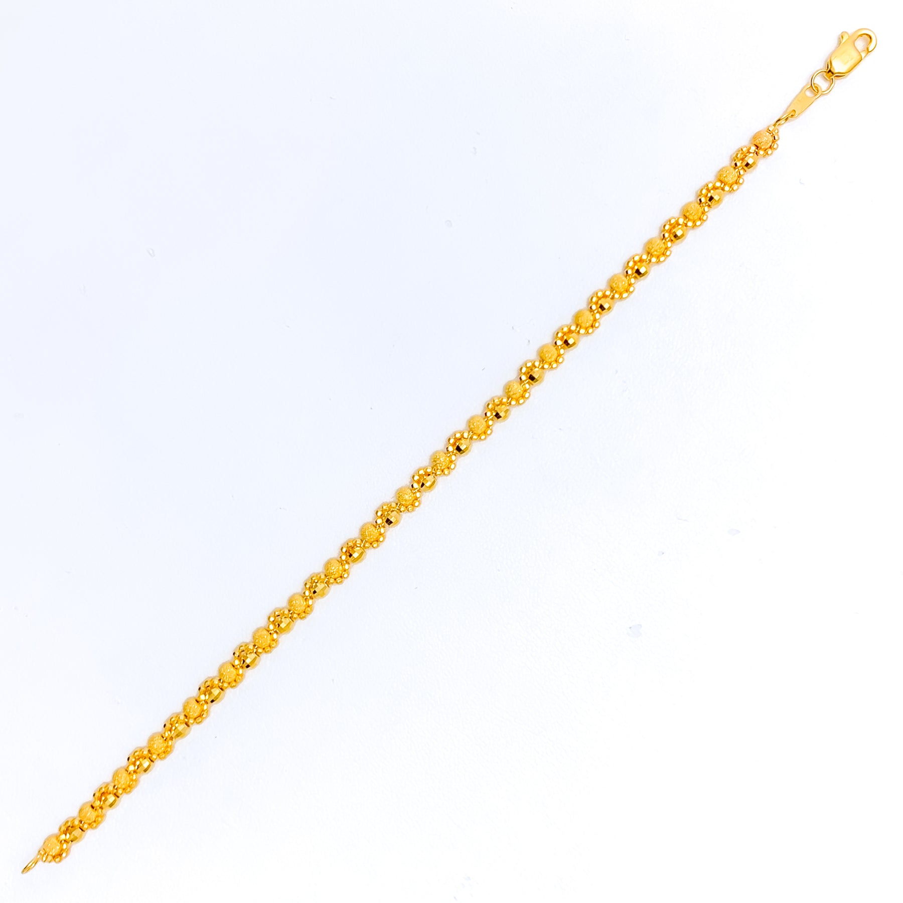 This exquisite 22k gold bracelet, weighing 8.5 grams, showcases a radiant design that exudes elegance and sophistication. The polished yellow gold finish enhances its refined craftsmanship, creating a timeless yet modern appeal. Measuring 7.3 inches in length, it provides a comfortable and secure fit, fastened with a durable lobster lock for reliability. A perfect fusion of versatility and luminous charm, this bracelet is a stunning addition to any fine jewelry collection, ideal for both everyday elegance and special occasions.
