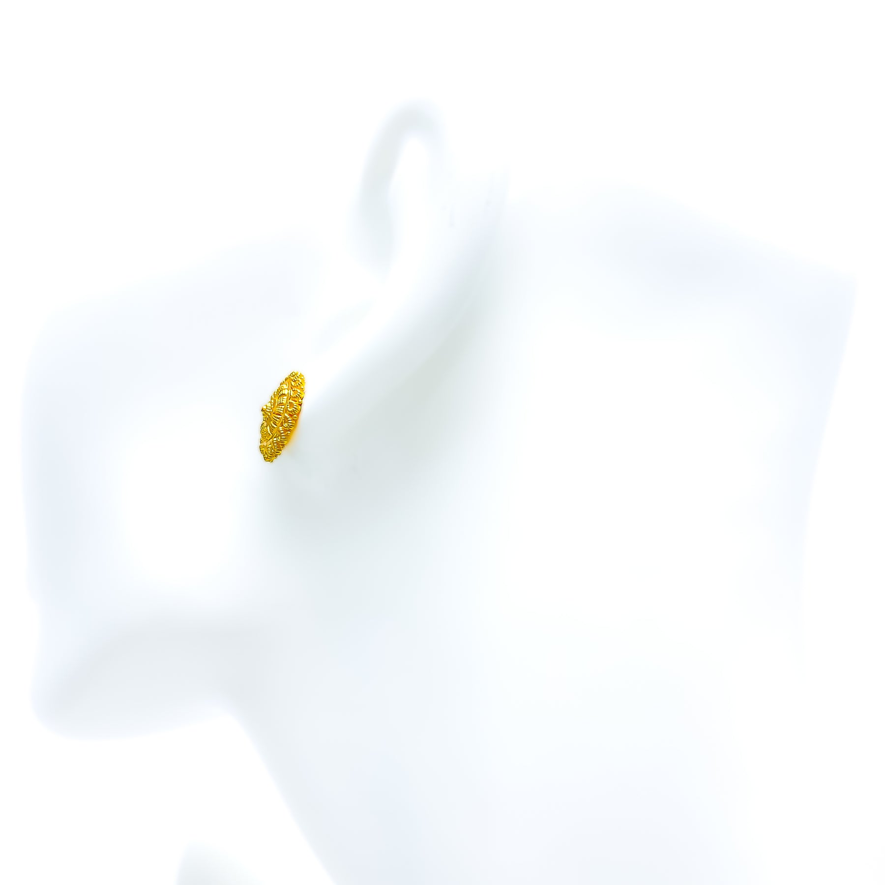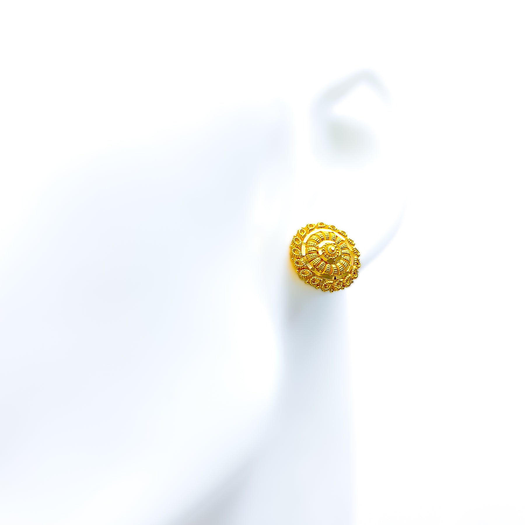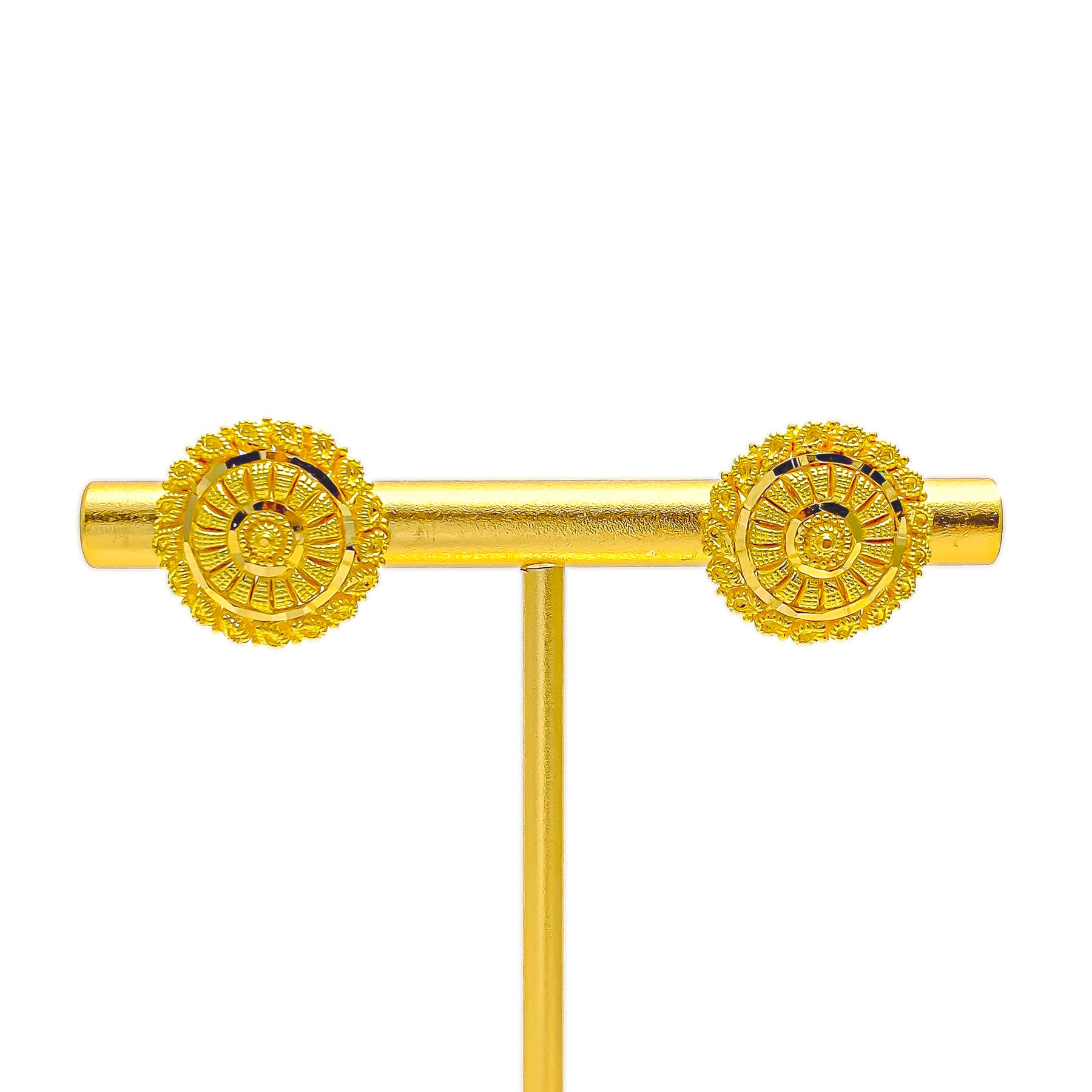 Confidently refined with a modern sensibility, these 22k yellow gold top earrings offer a sleek and versatile expression of everyday elegance. Weighing 4.4 grams and featuring a balanced 0.6" diameter, they provide a comfortable yet noticeable presence on the ear. The smooth yellow gold finish lends a polished glow that transitions effortlessly from casual wear to dressier moments. Completed with a secure screw-back post, they ensure reliable wear, poise, and lasting appeal throughout the day.