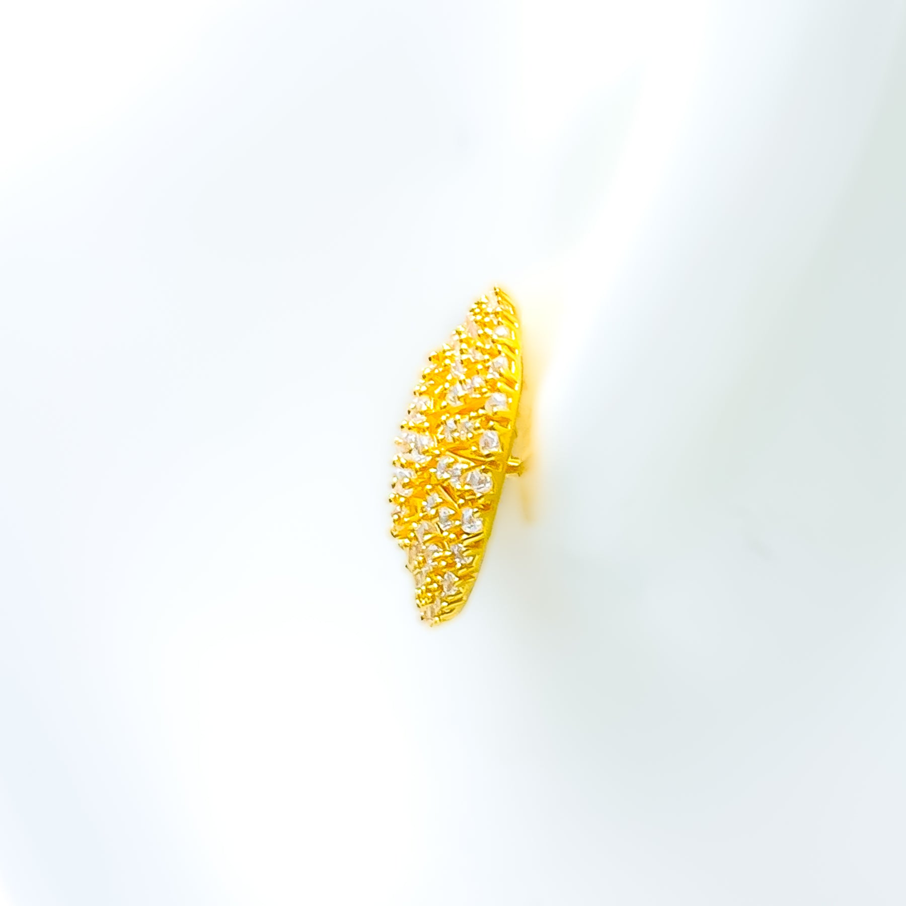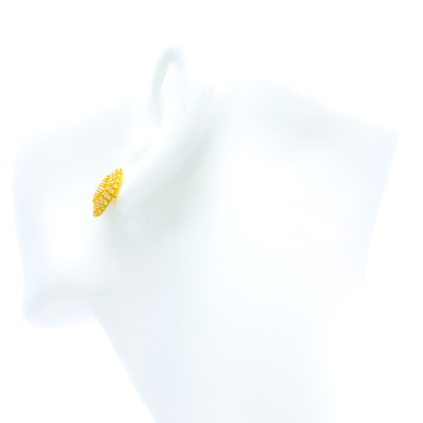 Bold and intricate, these 22k yellow gold earrings weigh 7.2 grams and feature a blooming floral design embellished with shimmering cubic zirconia. With a generous 0.75" diameter and secure screw-back posts, they offer standout presence and luxurious comfort. Designed to captivate, these tops exude ritzy elegance—perfect for grand celebrations or elevating your finest ensembles with graceful brilliance.