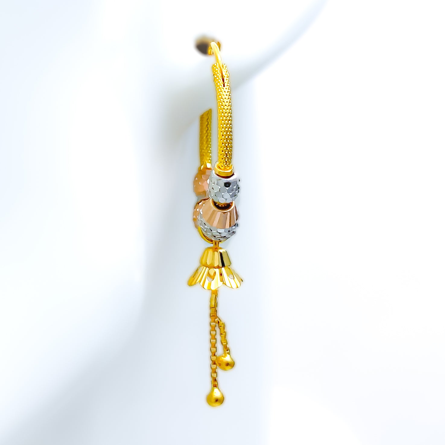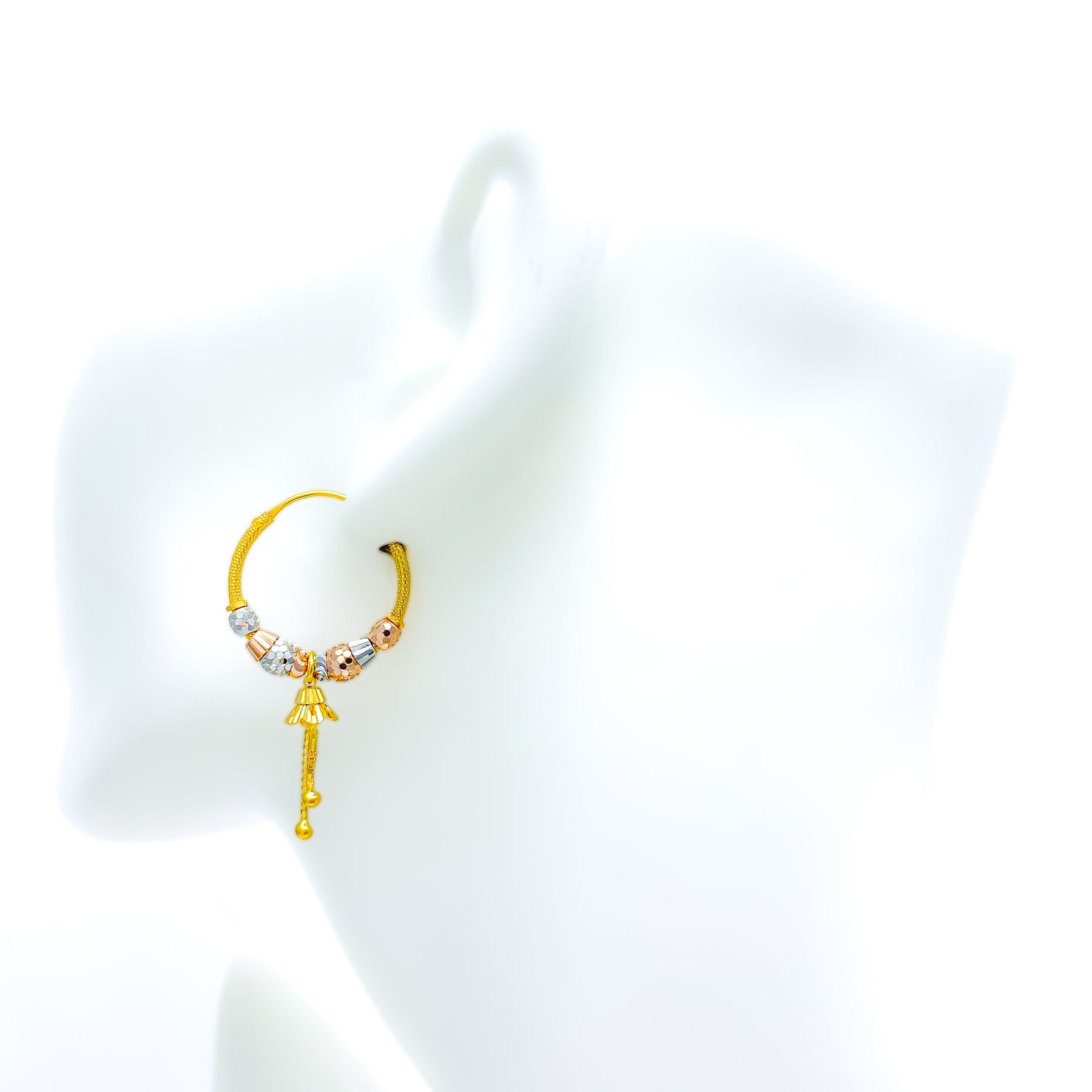 Flourishing in style, this 22k tri-tone Bali earring weighs 6.6 grams and features a polished yellow, white, and rose gold finish that enhances its blooming dynamic hoop design. Crafted in a classic Bali silhouette, it showcases a bold 0.9-inch diameter paired with an elegant 1.75-inch length for striking balance. The smooth hoop construction ensures comfortable wear while maintaining a refined, expressive profile throughout the day. Vibrant yet timeless, this piece offers graceful charm ideal for festive occasions and elevated everyday styling.
