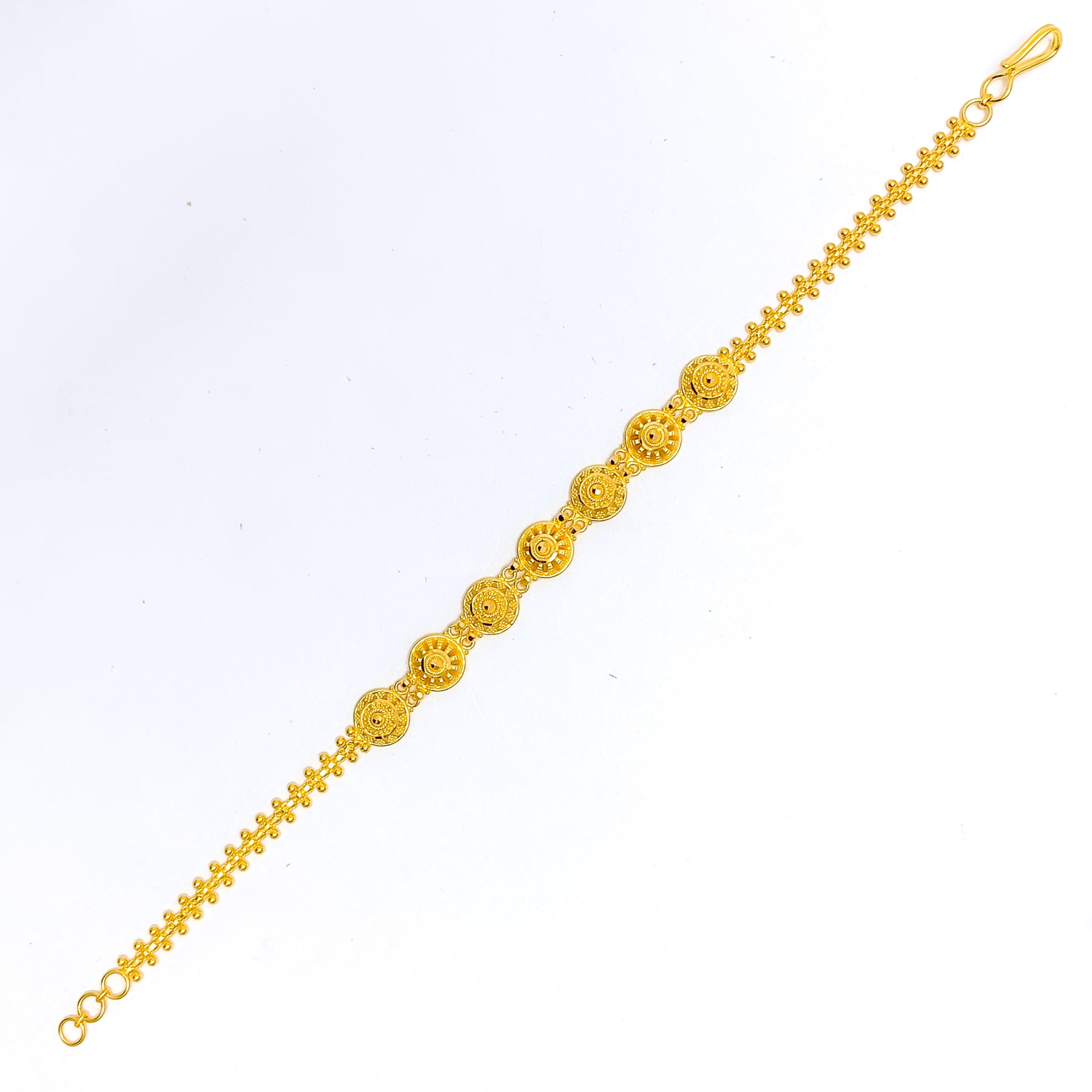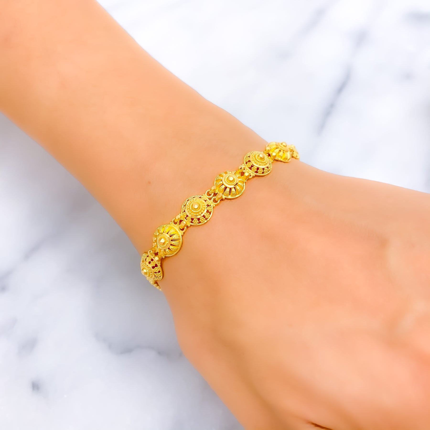 Gracefully sculpted, this 22k yellow gold bracelet weighs 8.2 grams and features a polished finish showcasing a charming floral dome design with refined dimension. Designed with an 8-inch length, it offers a comfortable fit supported by 0.6-inch adjustable links for flexible wear. The secure hook lock closure ensures dependable fastening while maintaining a sleek, elegant profile. Feminine yet timeless, this bracelet delivers sophisticated charm ideal for festive occasions and elevated everyday styling.
