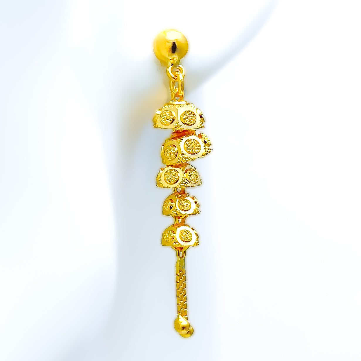 Elegantly flowing, these 22k yellow gold hanging earrings weigh 5.8 grams and feature a polished finish that enhances their dressy tassel-inspired design with refined brilliance. Crafted in a graceful hanging style, they measure 1.7 inches in length, offering balanced movement with eye-catching presence. The push-back post ensures comfortable, secure wear while maintaining a sleek and expressive silhouette throughout the day. Stylish yet timeless, these earrings deliver sophisticated charm ideal for festive occasions and elevated everyday styling.