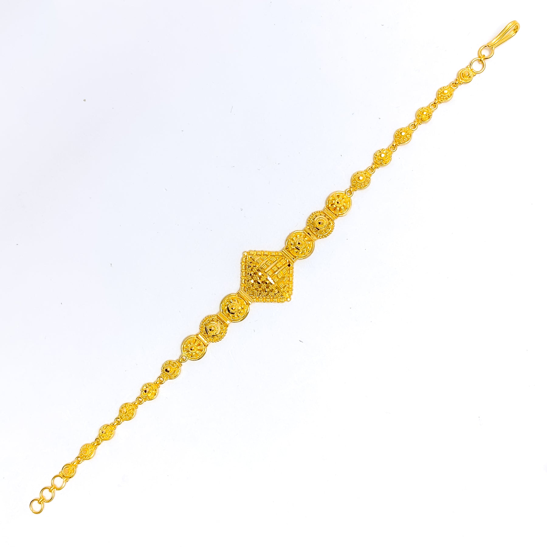 Intricately crafted, this 22k yellow gold bracelet weighs 10.5 grams and features a polished finish highlighting an ornate diamond-shaped design with refined dimension. Designed with a 7.5-inch length, it offers a comfortable fit supported by 0.6-inch adjustable links for flexible wear. The secure hook lock closure ensures dependable fastening while maintaining a sleek, elegant profile. Decorative yet timeless, this bracelet delivers graceful sophistication ideal for festive occasions and elevated everyday styling.