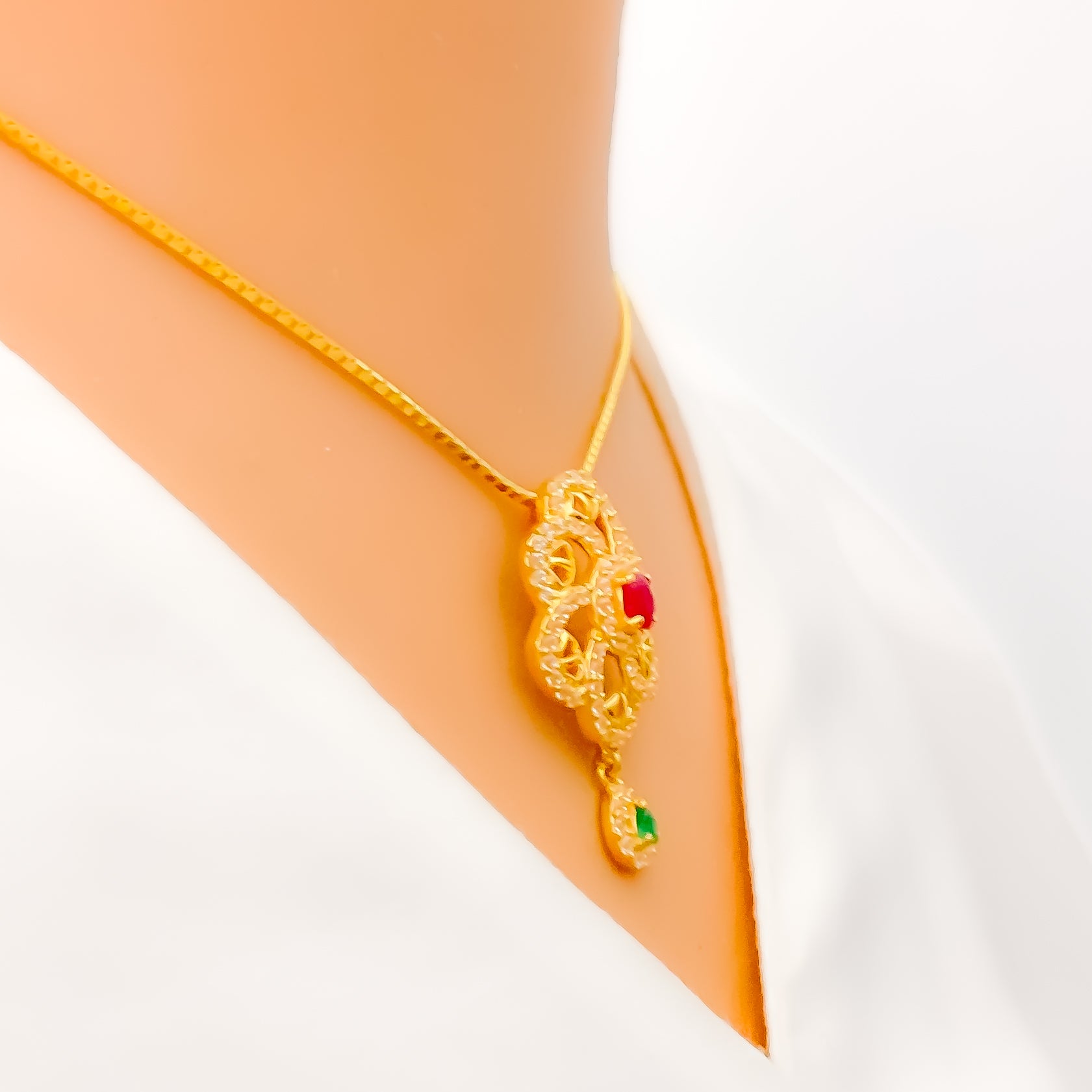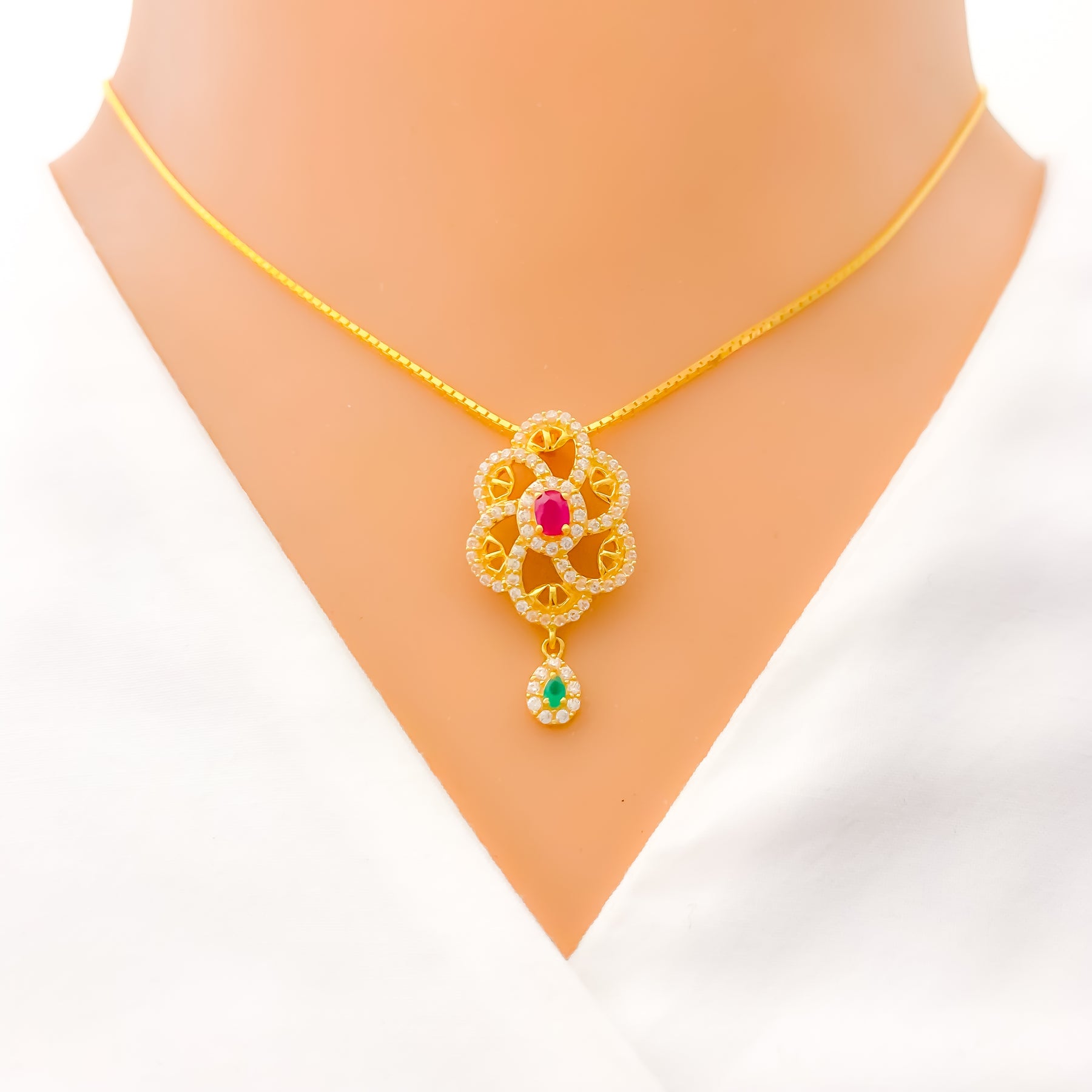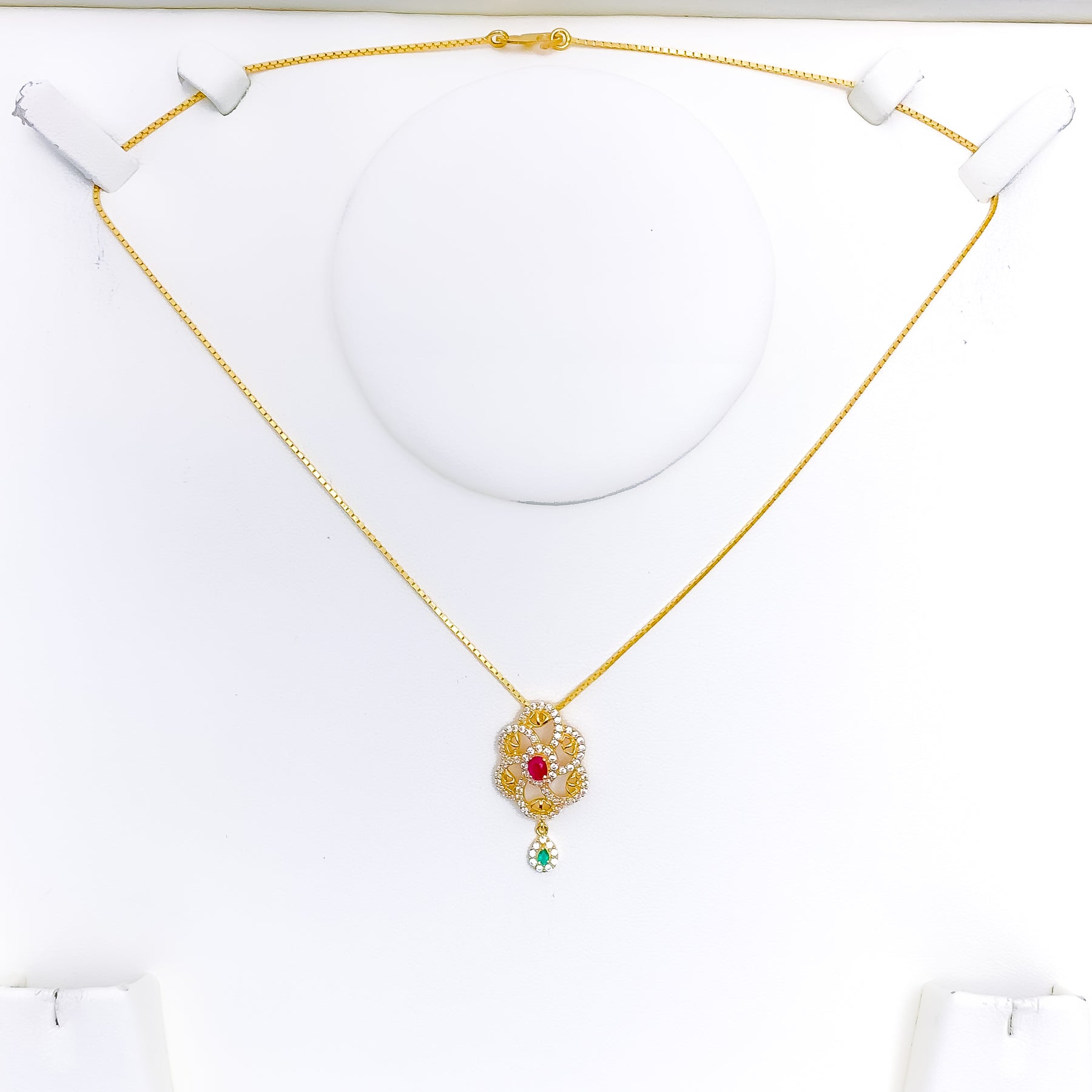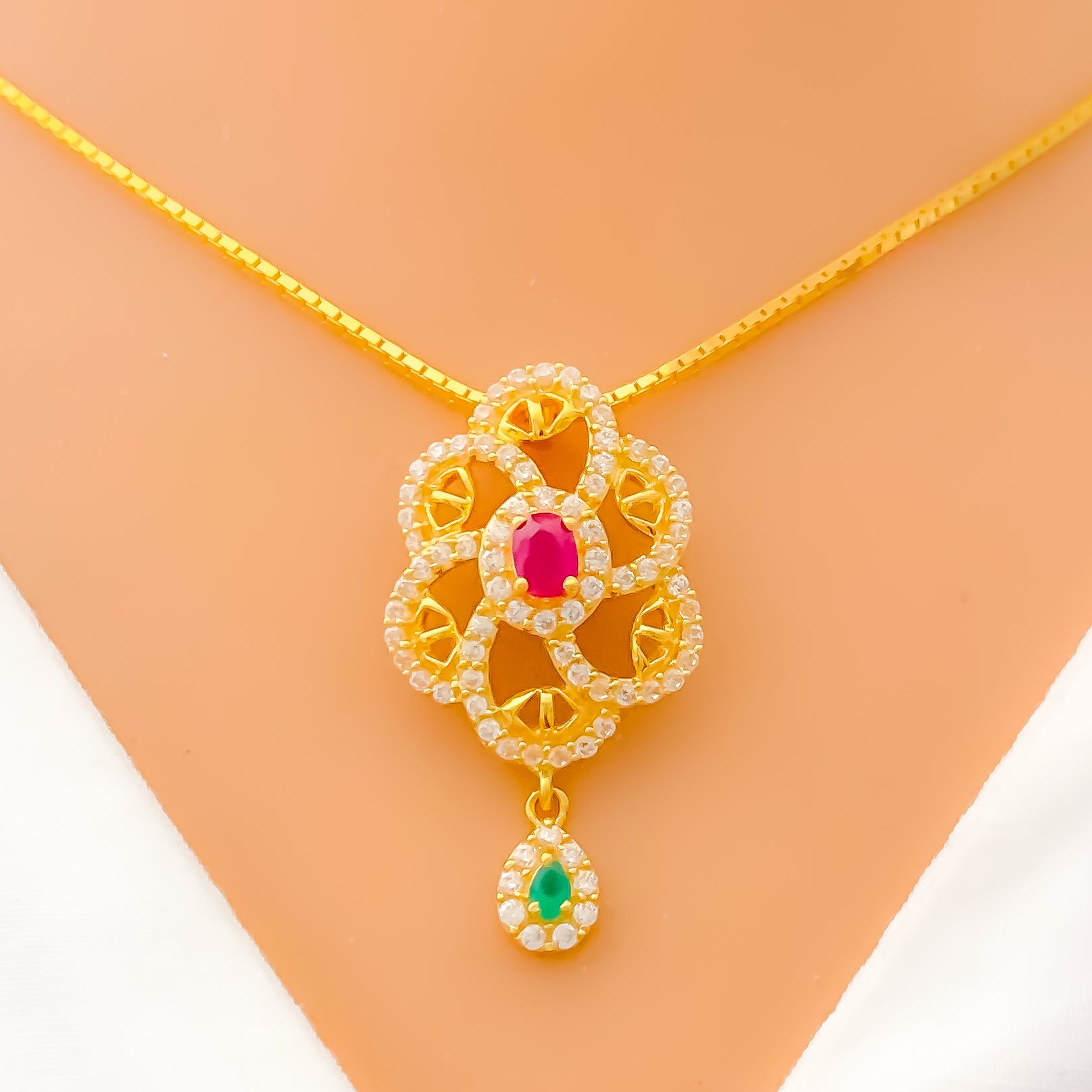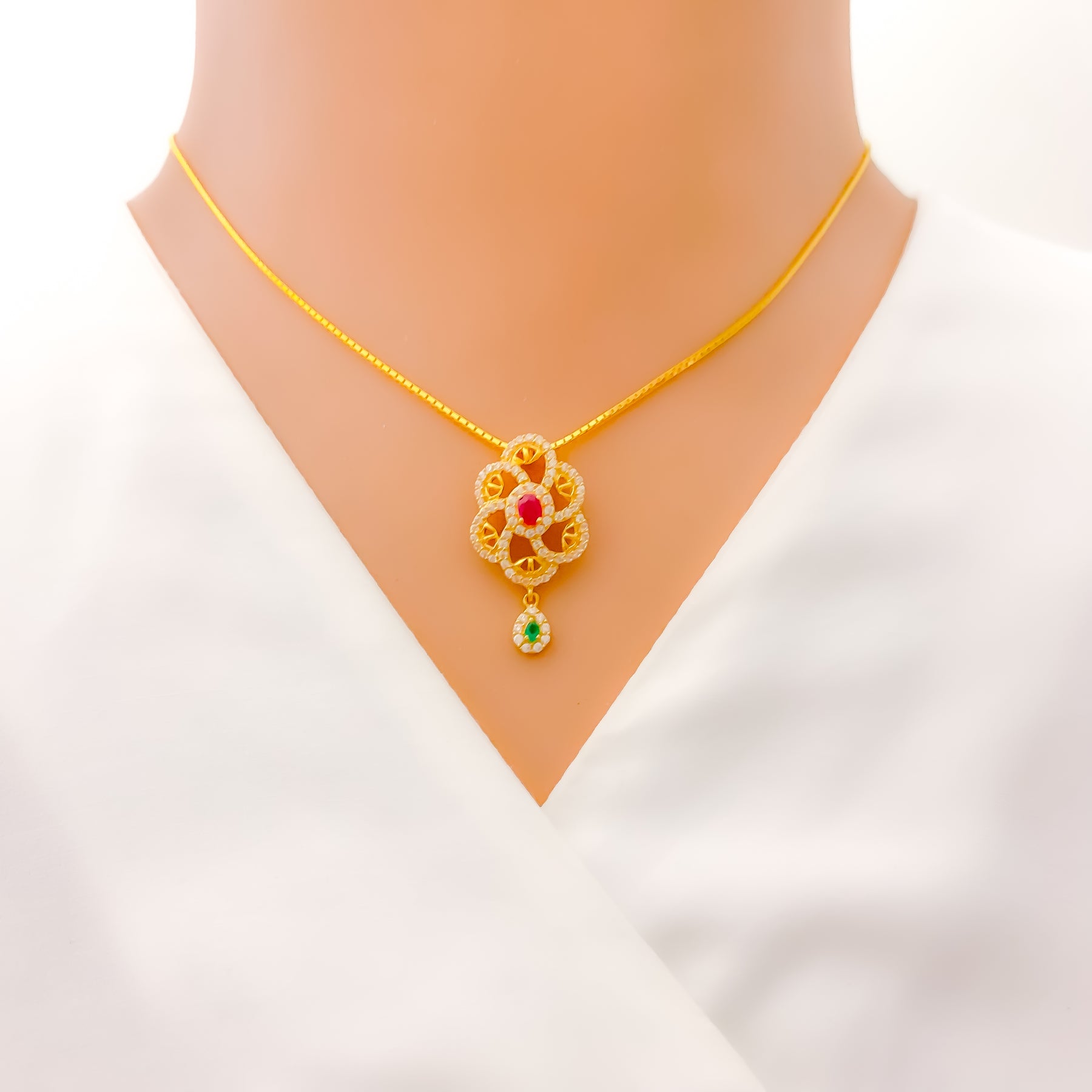 Elevate your look with our Timeless Fanned Floral Necklace. Crafted from 22k yellow gold with a weight of 6.7 grams, this statement piece features a delicate floral design adorned with sparkling cubic zirconia stones. The necklace measures 16 inches in length with a 1.2-inch drop and a secure S lock. Perfect for adding a touch of luxury to any outfit. Shop now and make a statement with our stunning Timeless Fanned Floral Necklace.