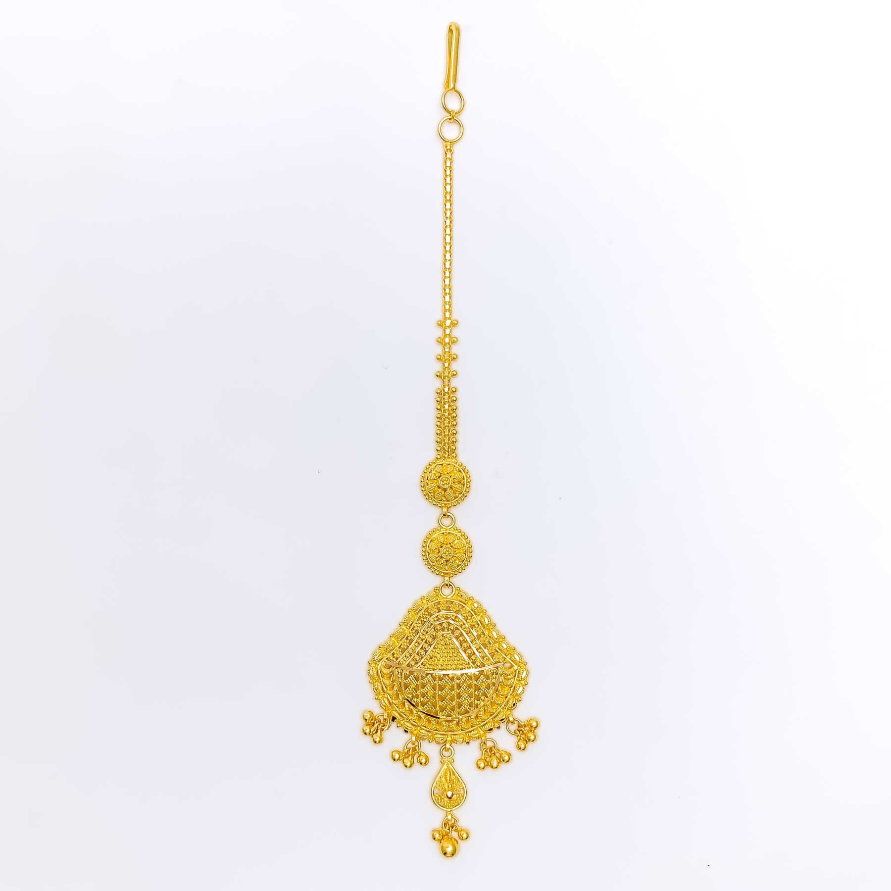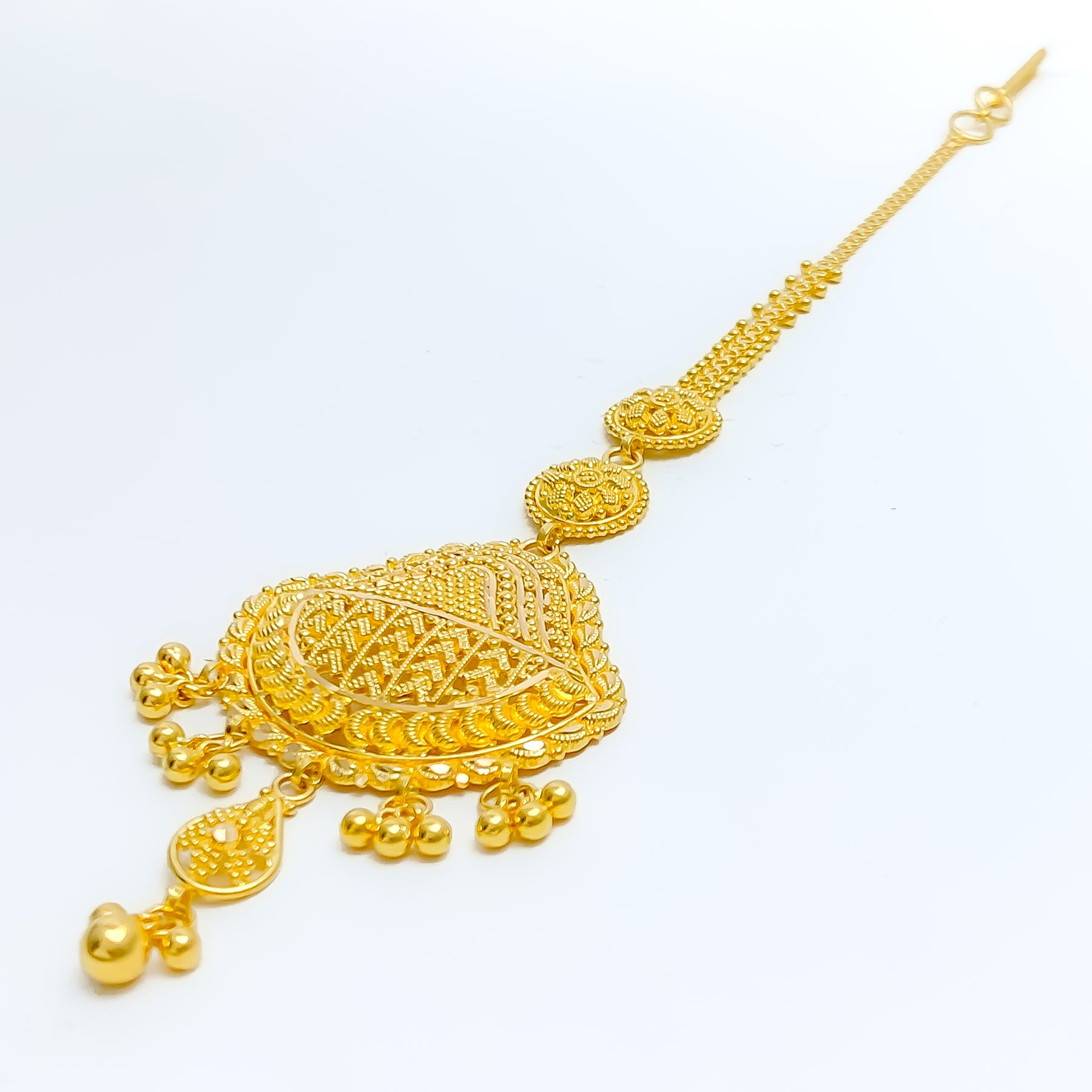 Elegantly adorned with cascading charm, this 22k yellow gold tikka weighs 9.9 grams and measures 6.3 inches. The tasseled design adds dynamic movement and traditional flair, while a secure hook clasp ensures lasting comfort. A decorative statement piece perfect for celebratory and cultural occasions.