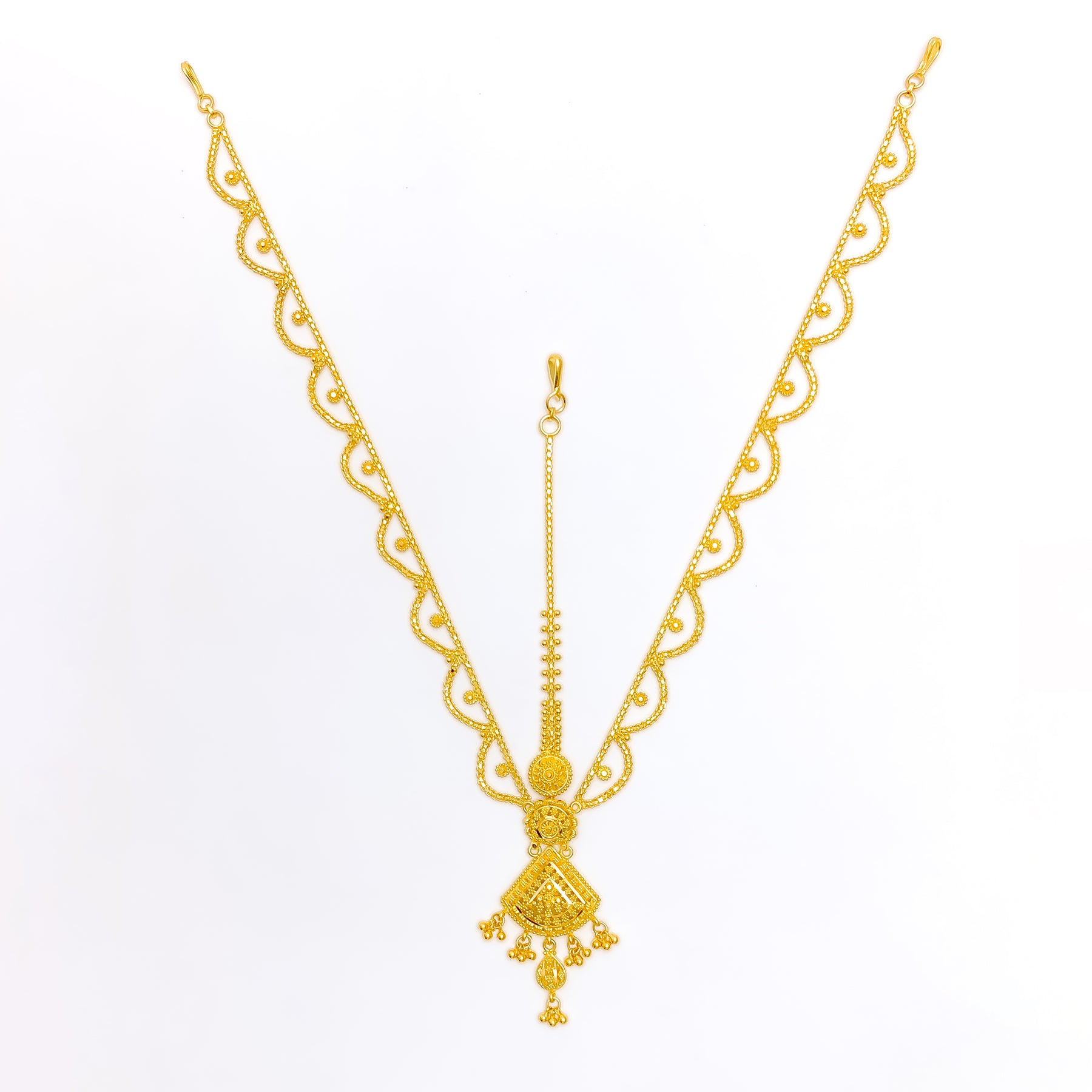 This stunning 22k gold matha patti, weighing 18.5 grams, features a radiant yellow gold finish and an elevated design. The tikka measures 5.5 inches in length, while the side chains are 6.8 inches long, ensuring a perfect fit and elegant drape. The matha patti is secured with a hook clasp style, adding ease of wear. Ideal for those who appreciate luxurious and sophisticated jewelry, this piece combines timeless beauty with an elevated aesthetic, making it a perfect choice for any special occasion or cultural celebration.