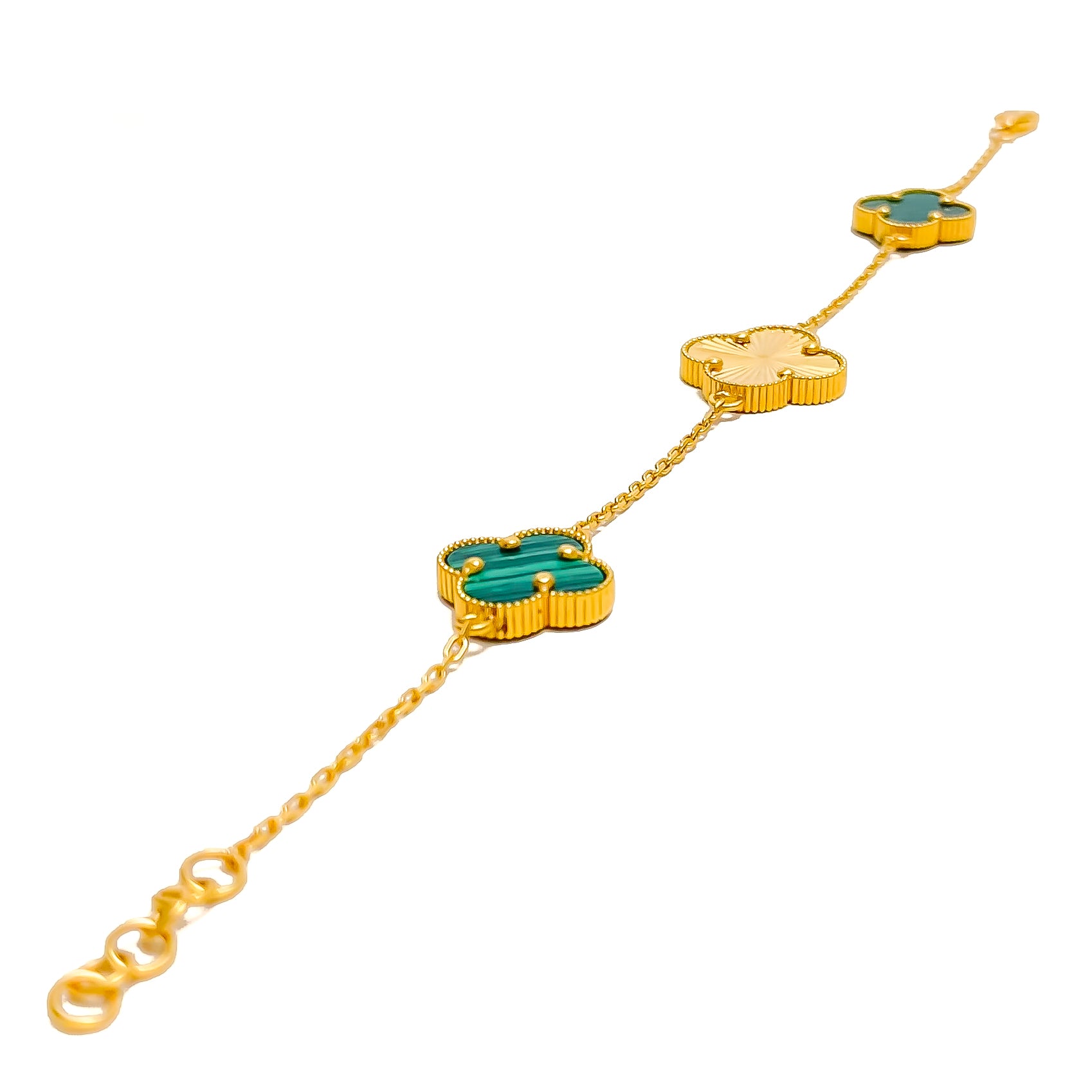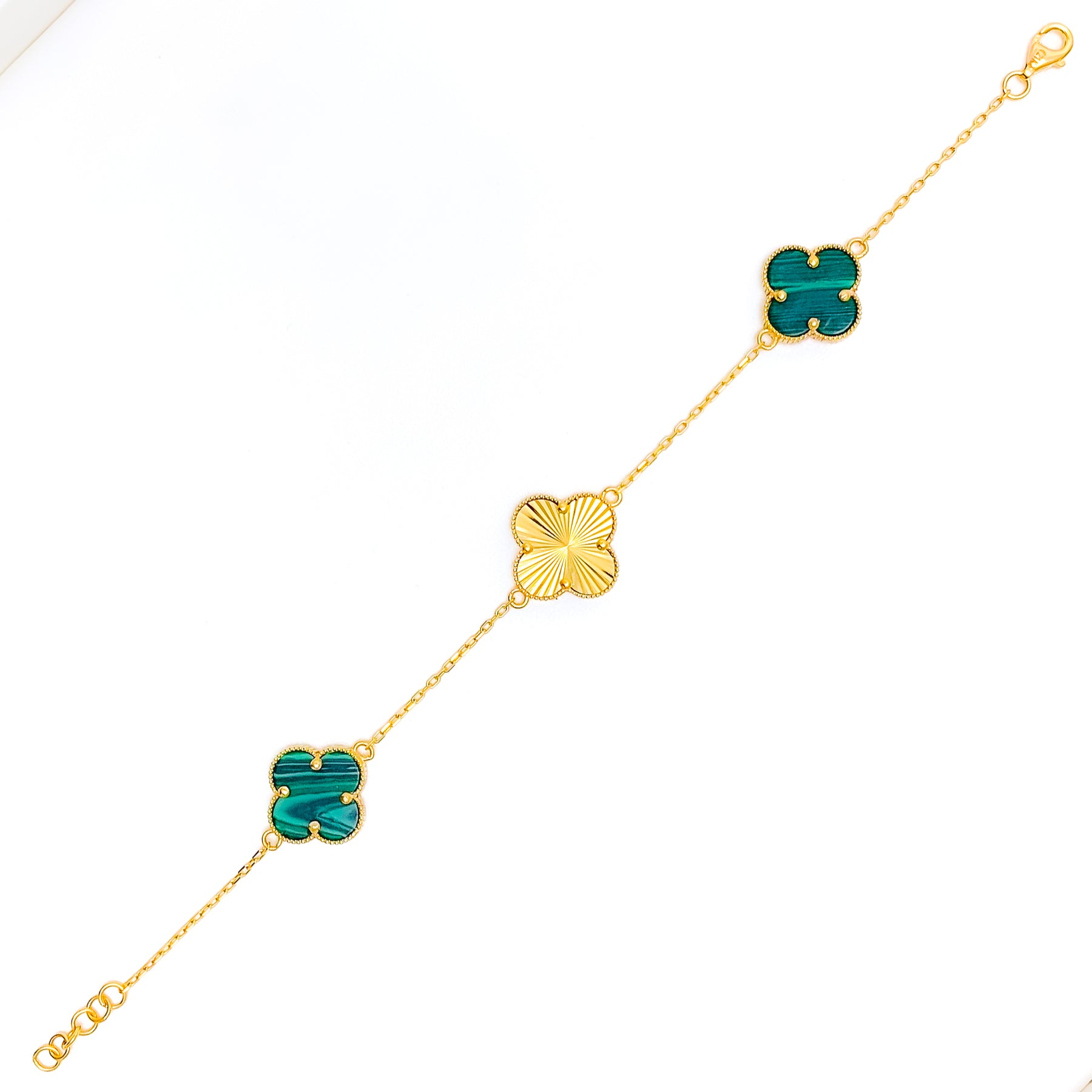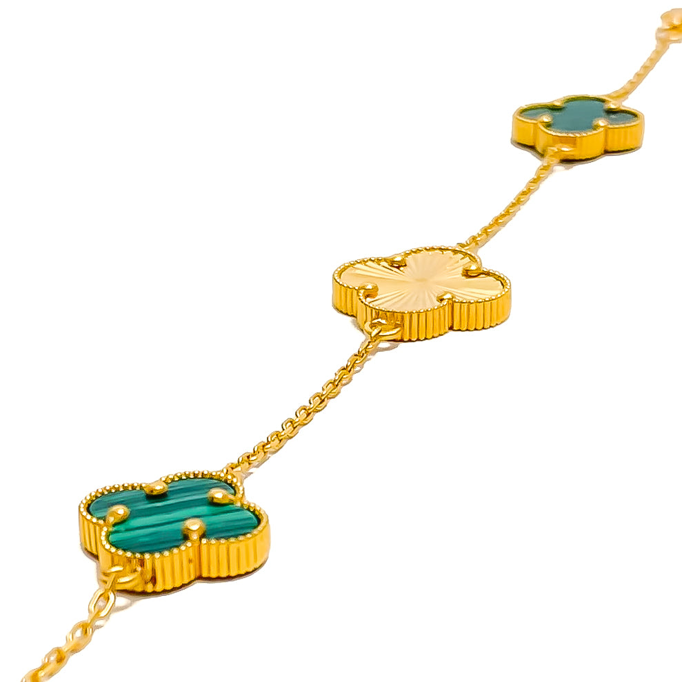 Indulge in luxury with our Lush Green Malachite 21k Gold Clover Bracelet. Opulent 6.6g of 21k gold, adorned with captivating Malachite. The 7.5" bracelet features adjustable 0.7" links and a secure Lobster Lock. Elevate your style with this exquisite piece.