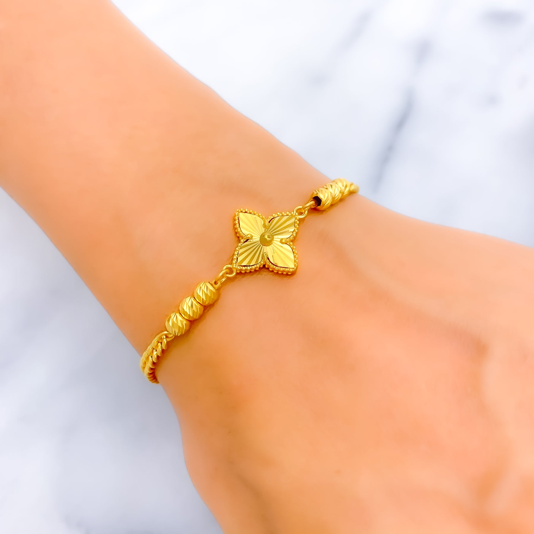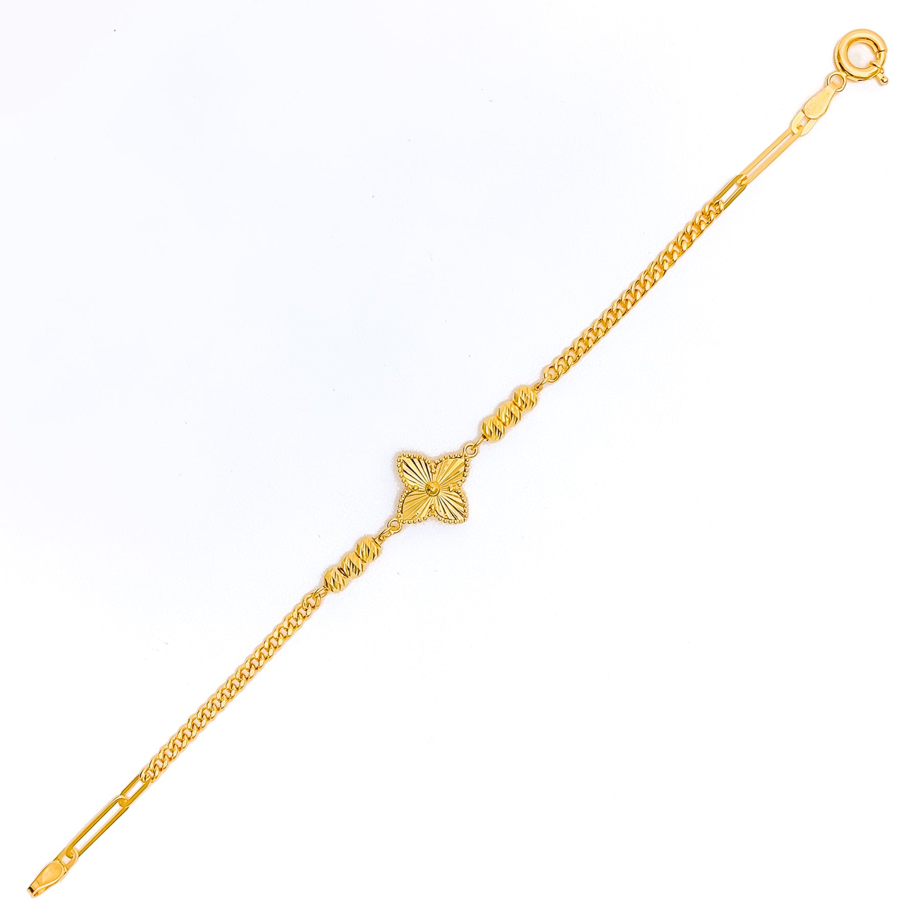 This 21k gold bracelet, weighing 5.6 grams, showcases a shiny blooming flower design. Its 7.25-inch length is finished in vibrant yellow gold, adding a touch of radiance. Secured with a lobster ring lock, it combines elegance with functionality. A perfect choice for lovers of floral and fine jewelry.