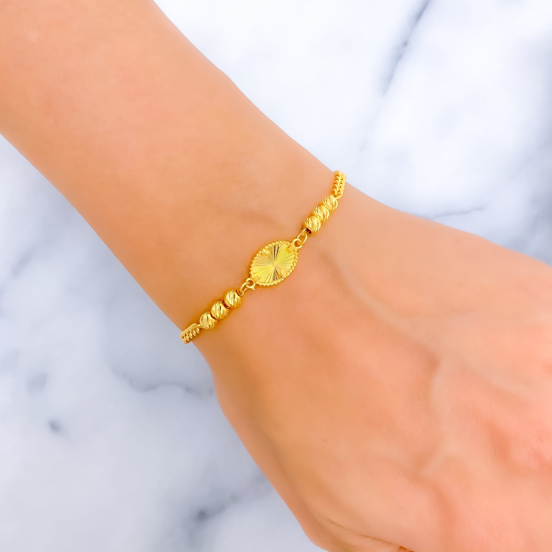 This 21k gold bracelet, weighing 4.8 grams, features a timeless bright oval design. The bracelet, measuring 7.25 inches, shines in a yellow gold finish. It's fastened with a lobster ring lock, offering a secure and stylish closure. Ideal for those who favor classic, understated elegance.