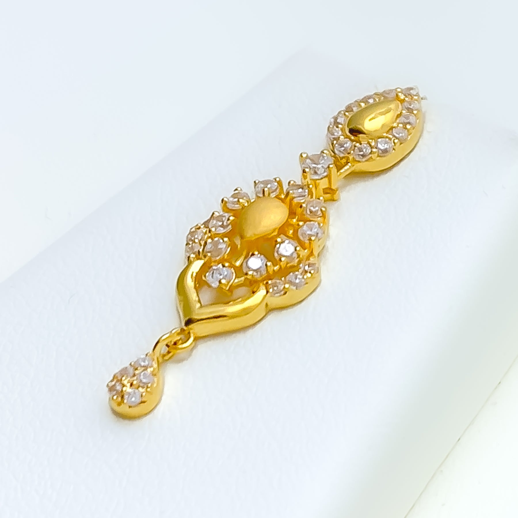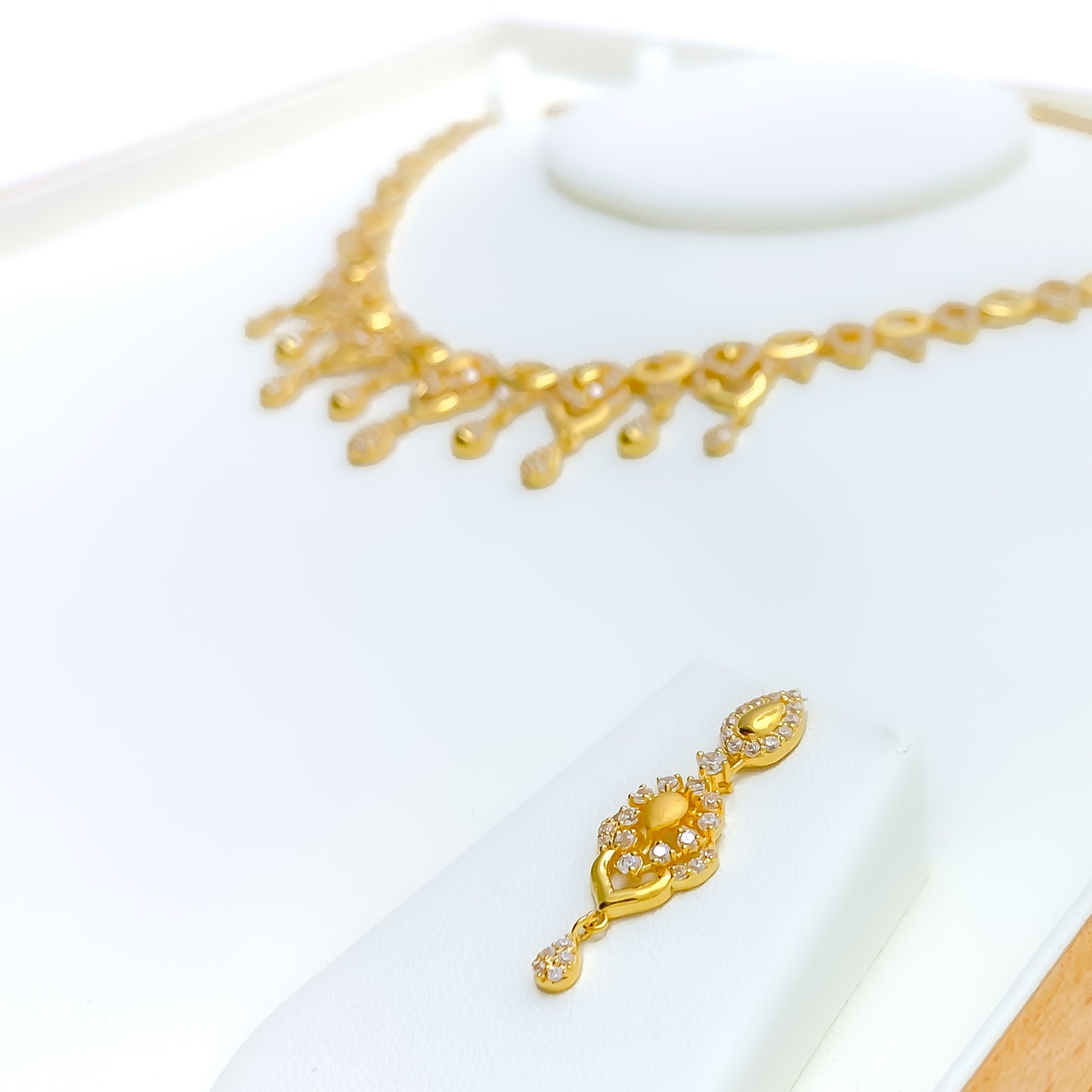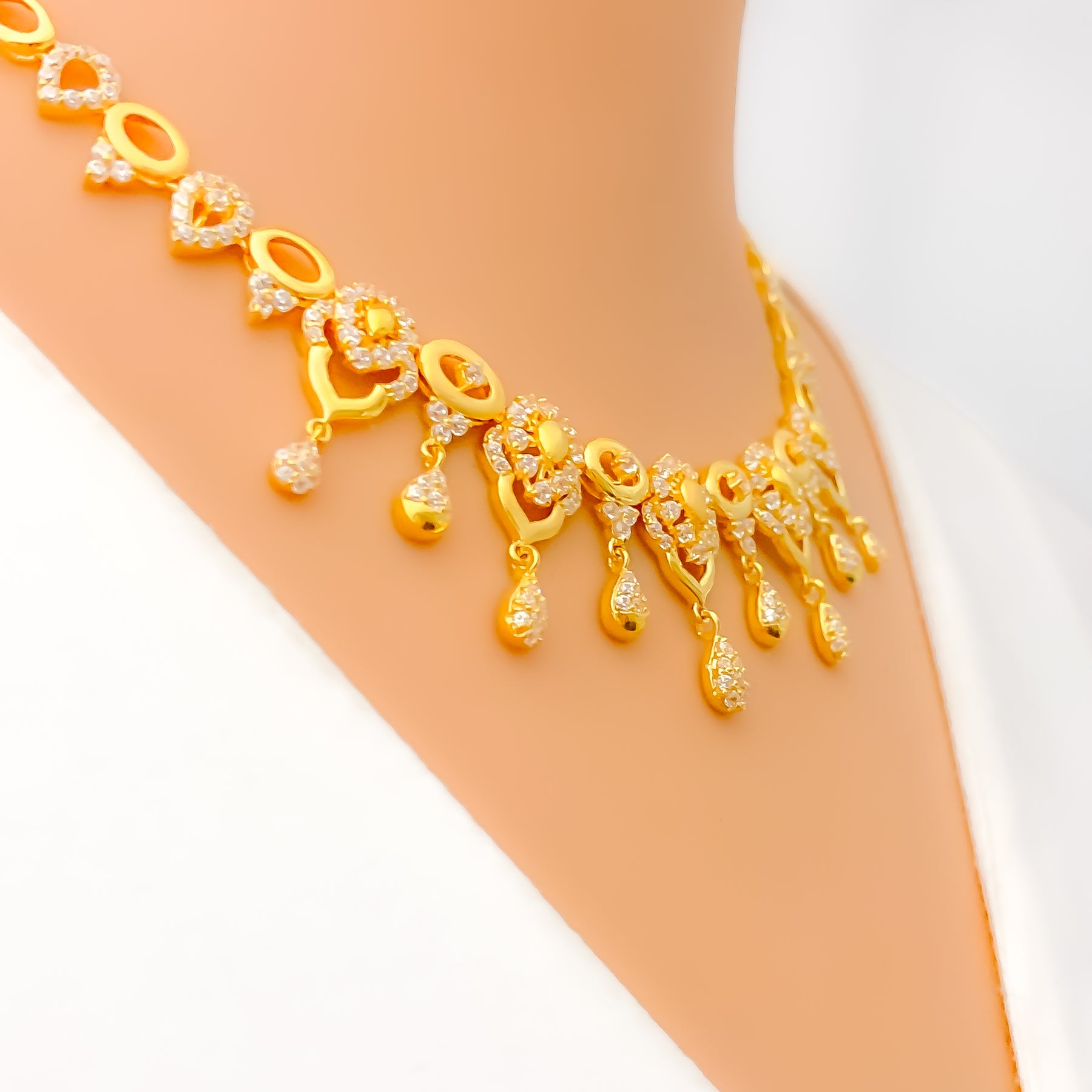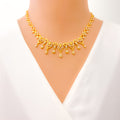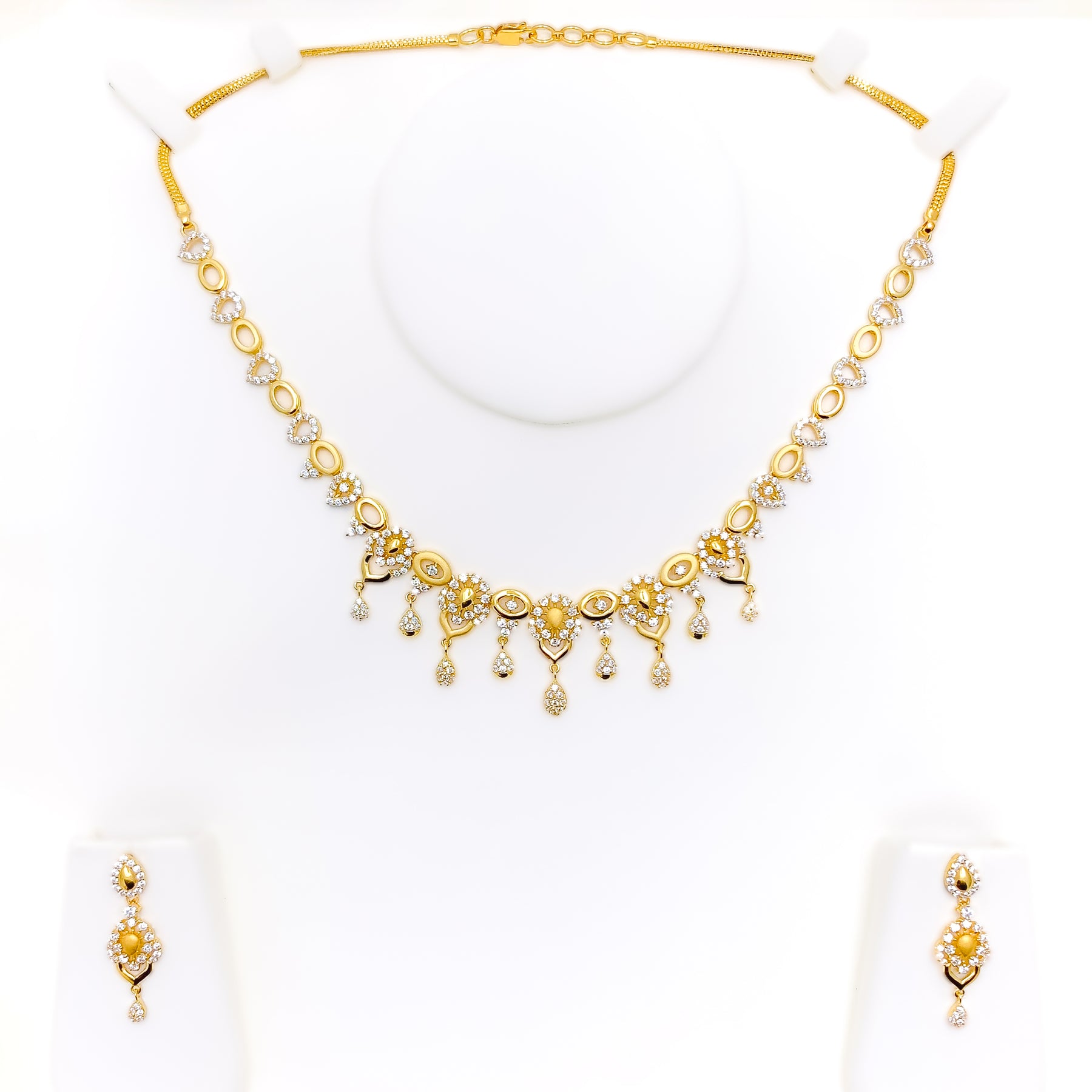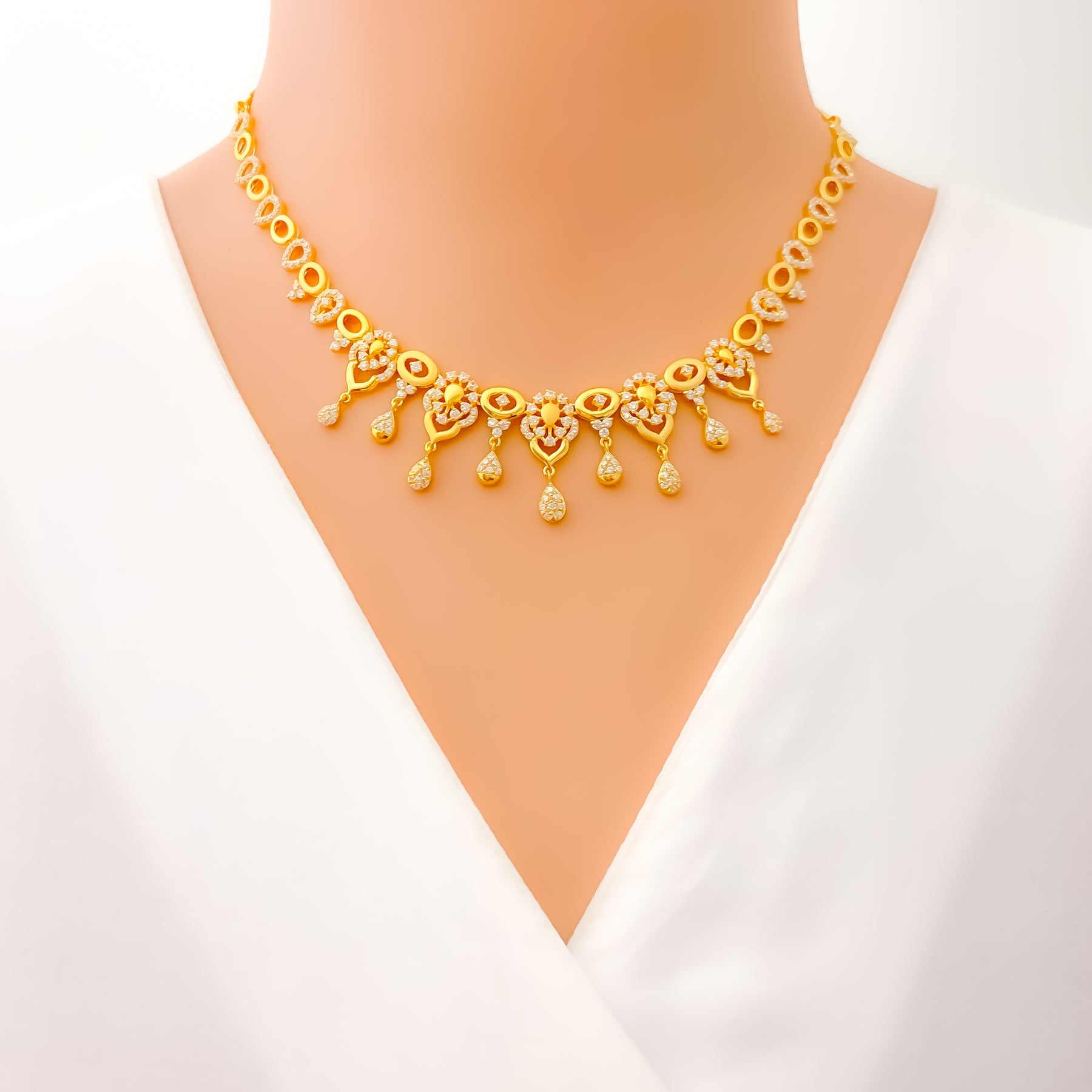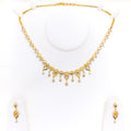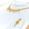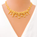Blending softness with sparkle, this 22k gold necklace set weighs 23.9 grams and features graceful CZ-embellished floral motifs with elegant drop accents. The 16-inch necklace includes 0.6-inch adjustable links for a comfortable fit, secured by a lobster lock. Coordinated 1.25-inch earrings with screw-back posts mirror the set’s refined detailing. With its warm yellow gold finish and feminine floral design, this piece is an enchanting choice for special occasions and graceful everyday elegance alike.