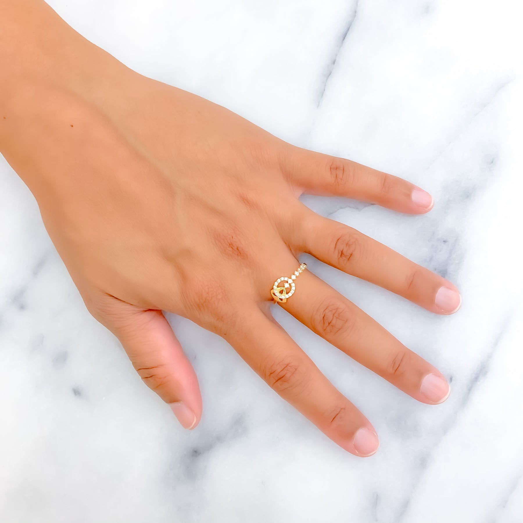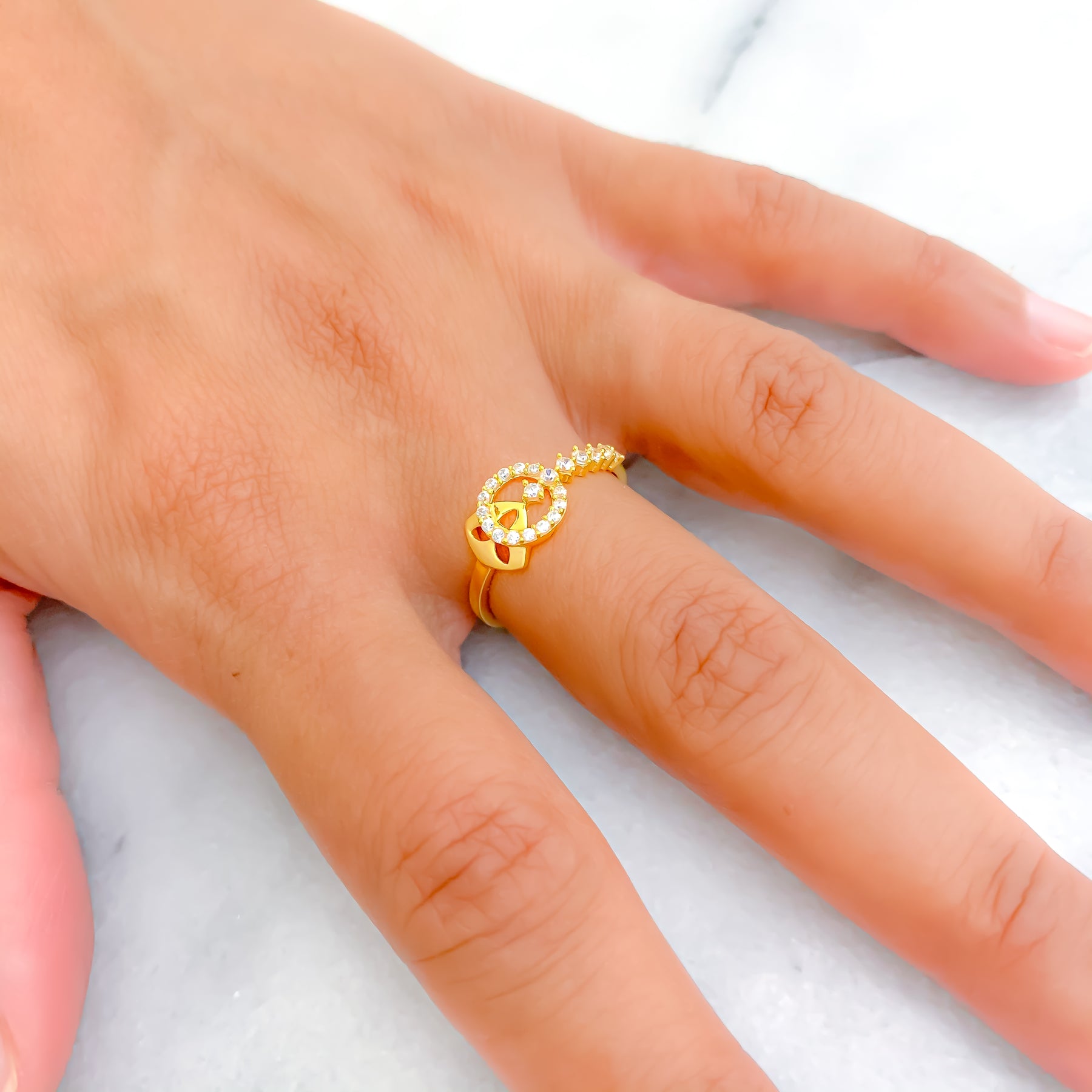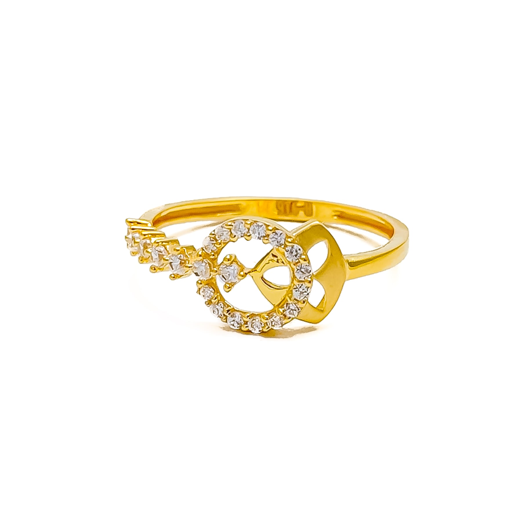 Delicately crafted in 22k yellow gold, this 1.8-gram ring gleams with luminescent beauty enhanced by precisely set cubic zirconia stones. Its radiant polish and adorned design exude understated elegance, ideal for those who appreciate refined sophistication. The lightweight build offers both comfort and brilliance for daily wear. Available in size 7 with re-sizing options for a perfect fit.