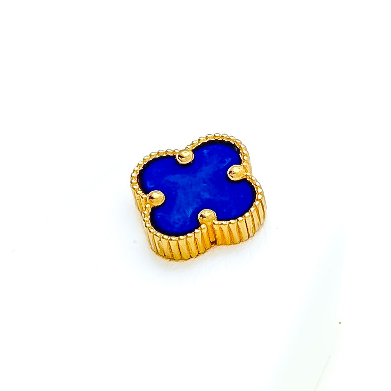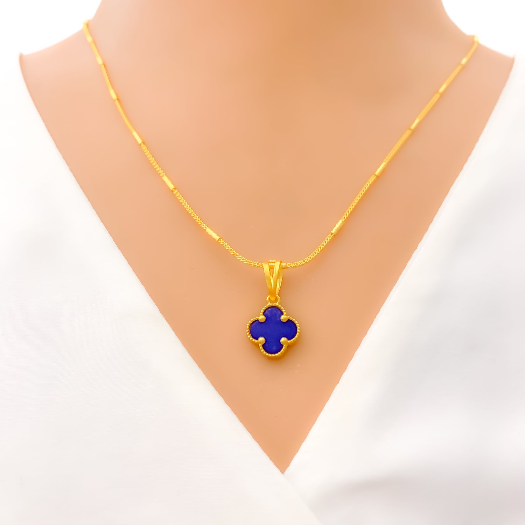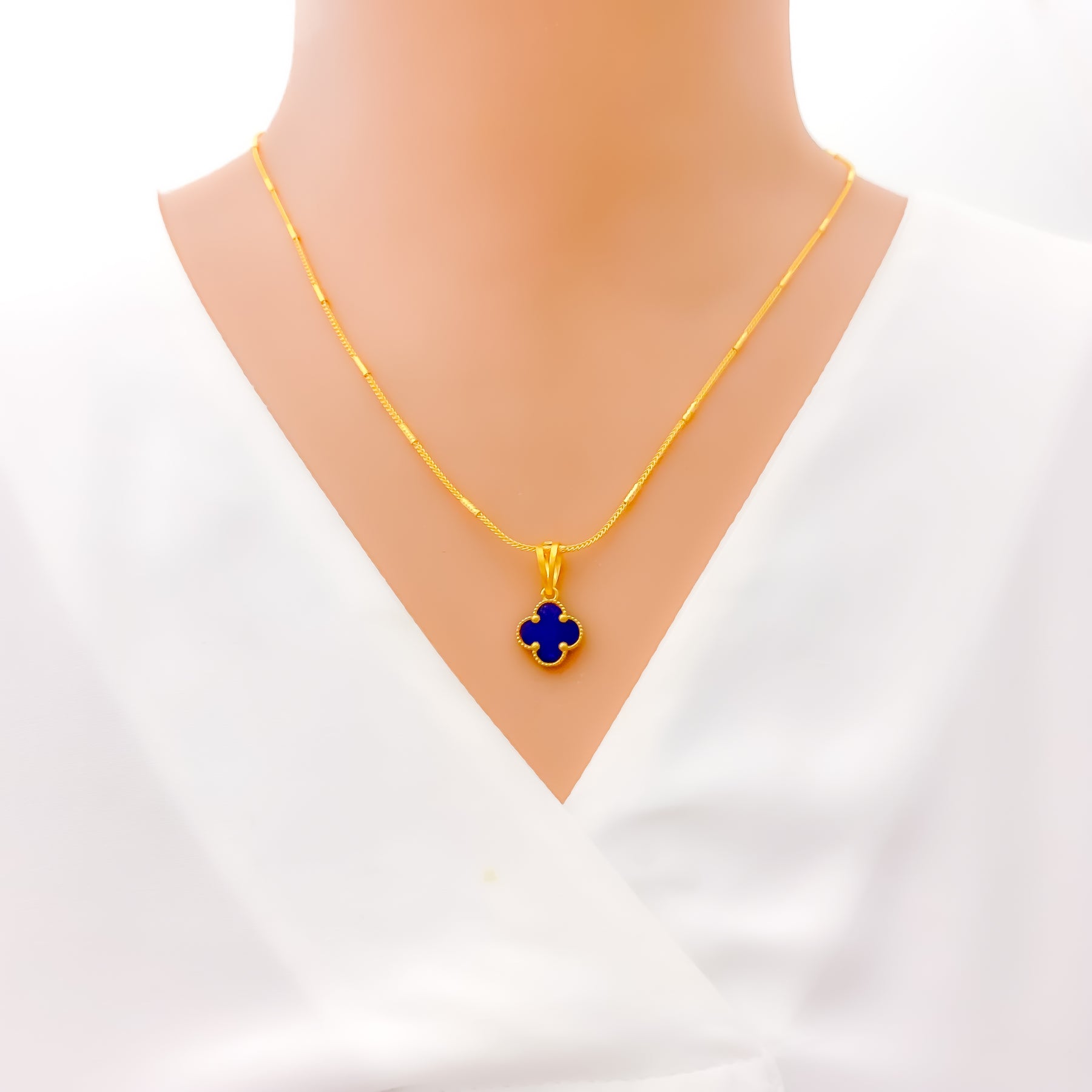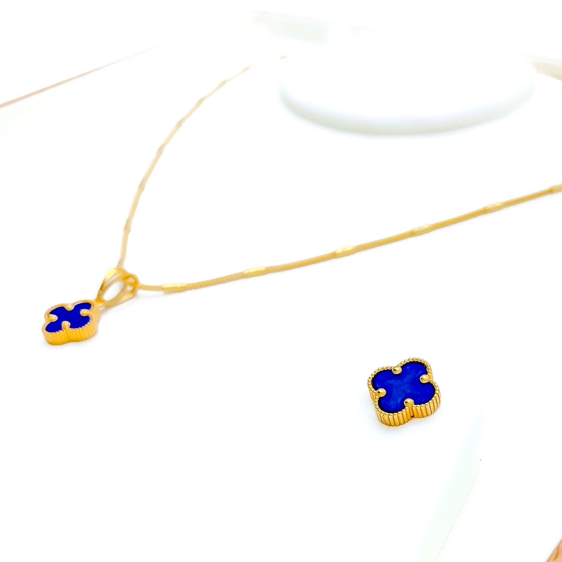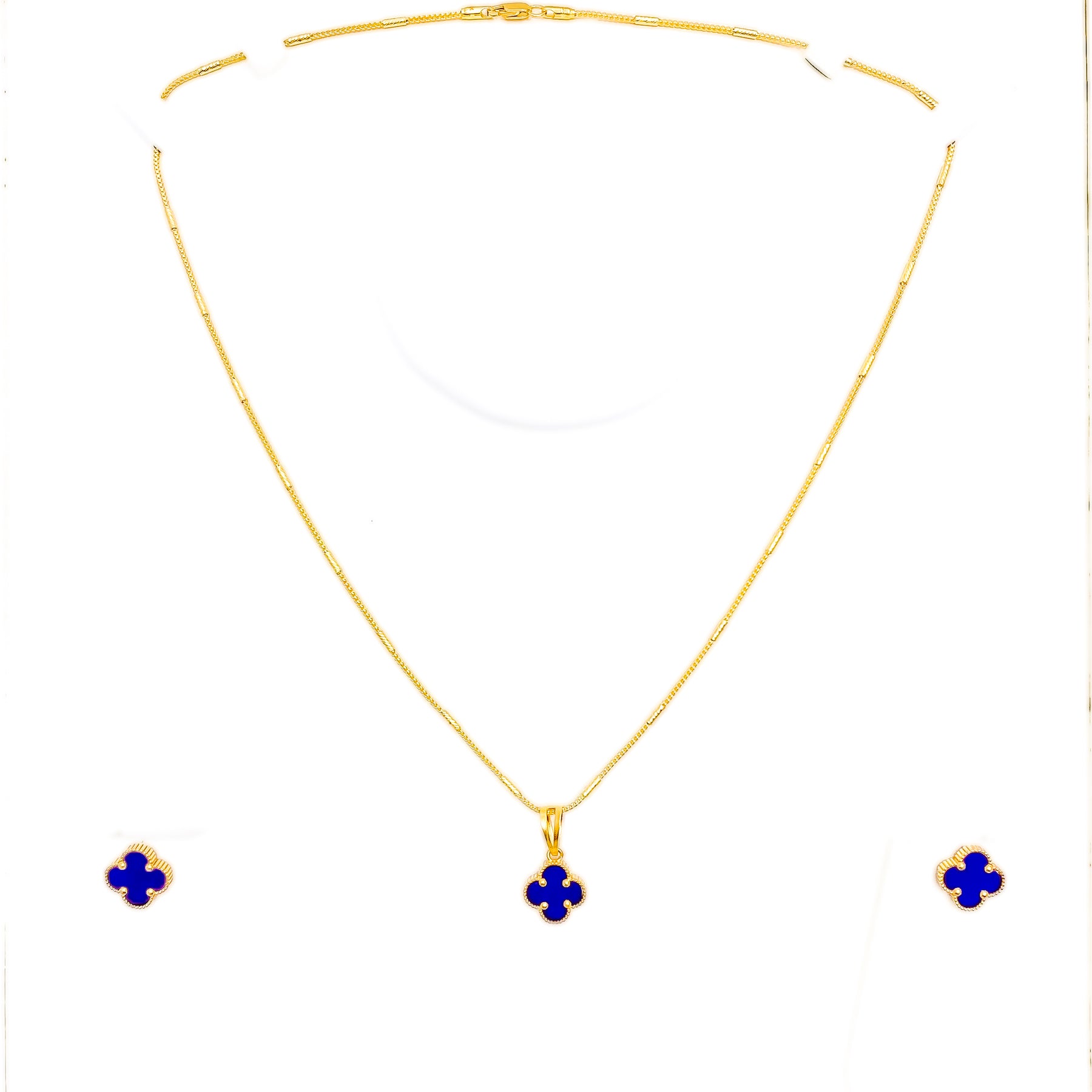 Ā Elevate your ensemble with this 21k yellow gold necklace set, adorned with lapis clover motifs. Weighing 11.1 grams, the set boasts an 18" necklace with a delicate 0.8" drop. Paired with matching 0.4" earrings, featuring push back posts. A lobster lock ensures secure wear.