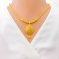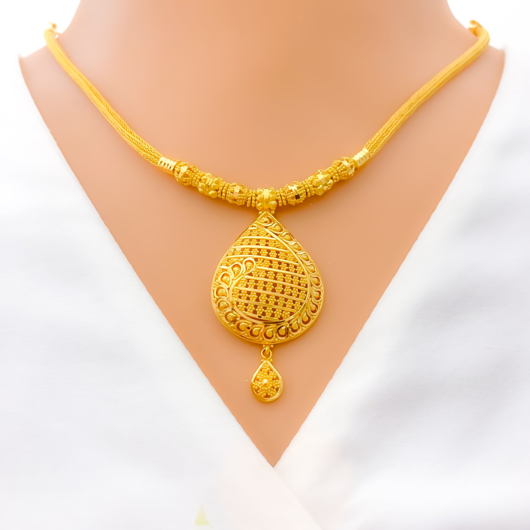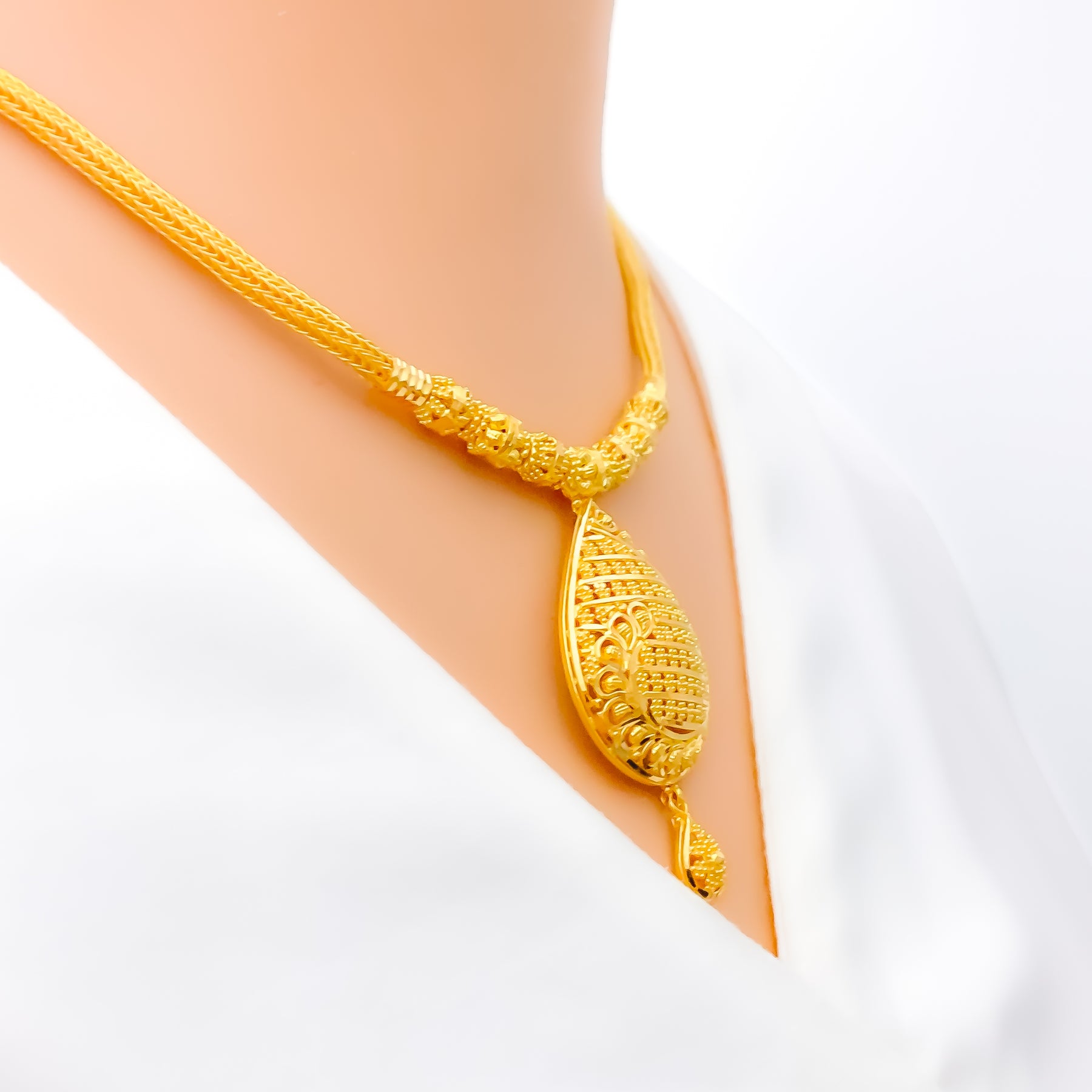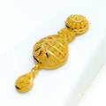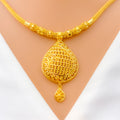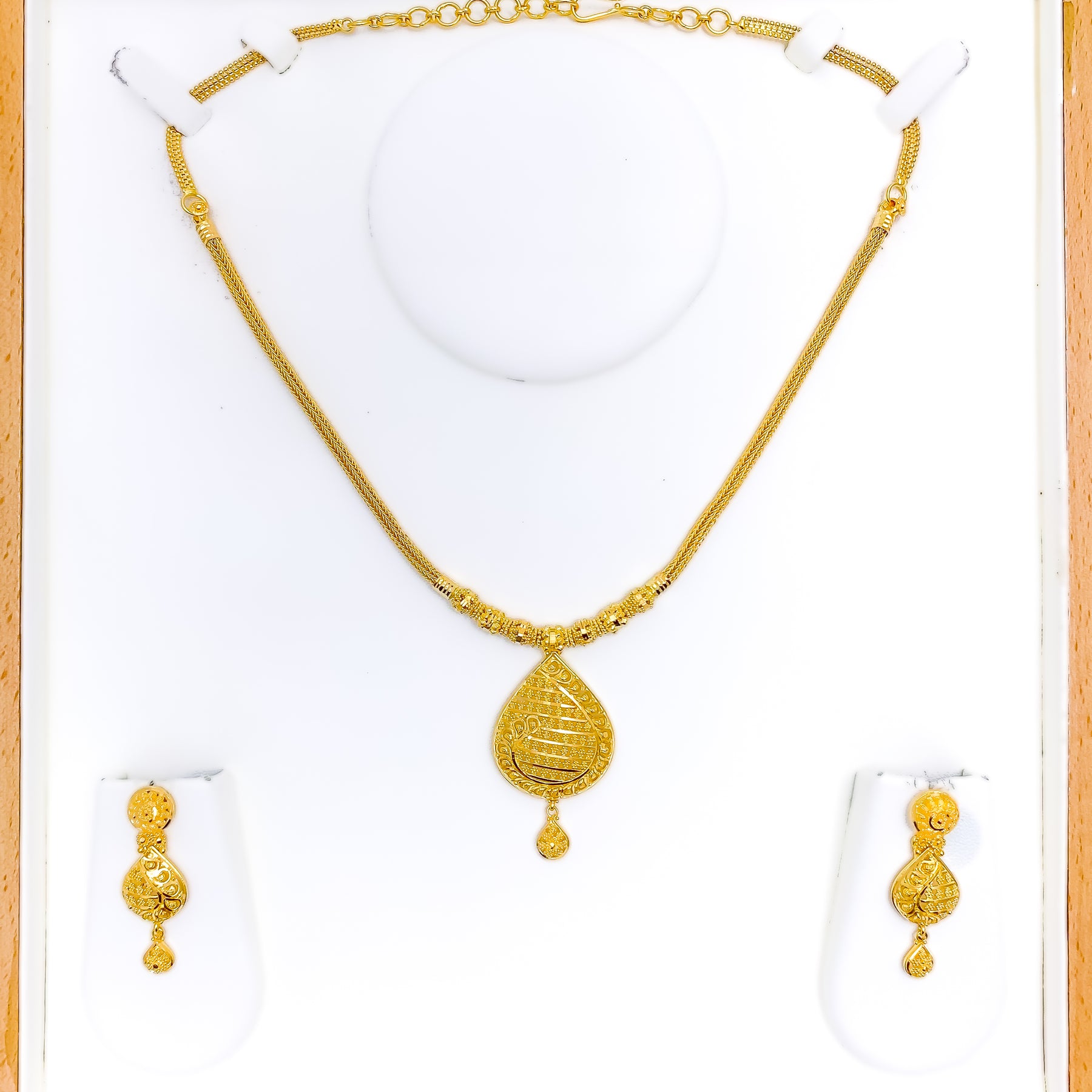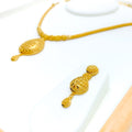 Glistening Elevated 22k Gold Drop Necklace Set, a symbol of timeless beauty and grace. Crafted with 34.2 grams of pure 22k gold, this exquisite piece radiates luxury. The lustrous yellow gold finish adds a touch of elegance. The set includes a 17" necklace with a 1.8" drop, secured with a stylish hook lock. Complete your ensemble with the included matching earrings, boasting a 1.5" length and screw back posts. Elevate your style with this high fashion creation, designed to make a statement wherever you go.