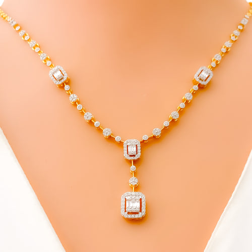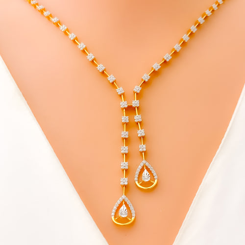 This exquisite 18k white gold necklace set, weighing 38.4 grams, features a bold and unique design adorned with dazzling diamonds. The white gold finish enhances its luxurious appeal, making it perfect for any special occasion. The set includes a necklace with a total diamond weight of 7.03 carats, featuring F-G color and VS quality diamonds in round shapes. The necklace has a length of 17.5 inches with a striking 3-inch drop length, secured with a lobster lock. The matching earrings, each measuring 0.5 inches in length with push-back posts and clasps, complete the set. Ideal for those who appreciate high-quality craftsmanship and statement pieces, this diamond necklace set is a cherished addition to any jewelry collection.