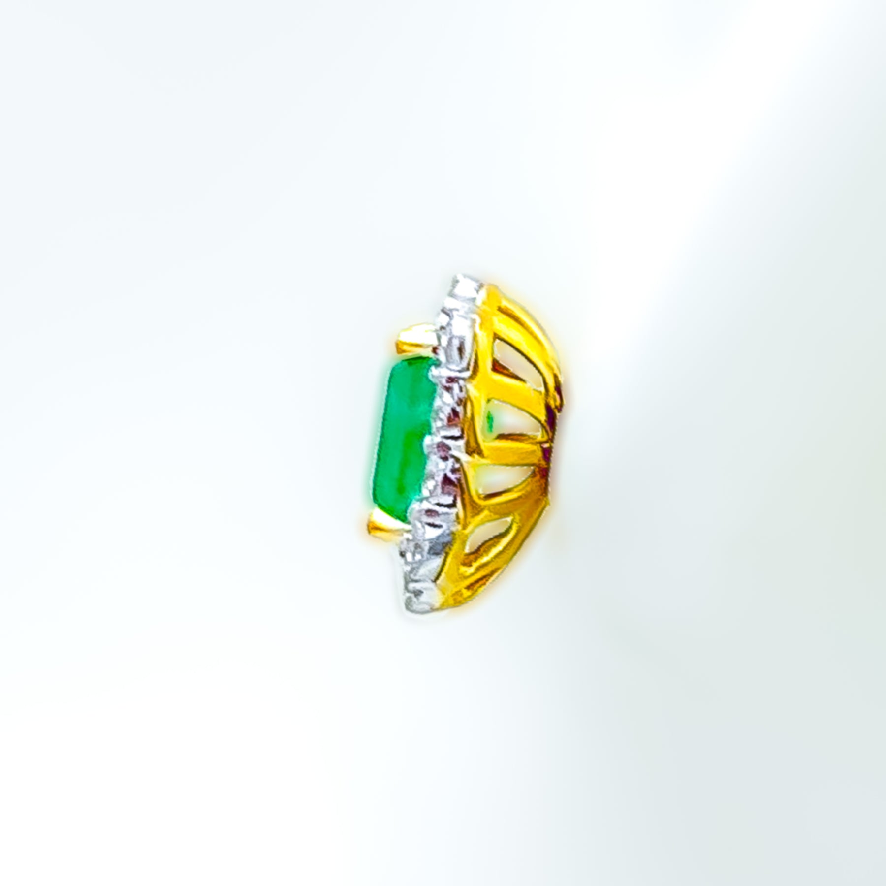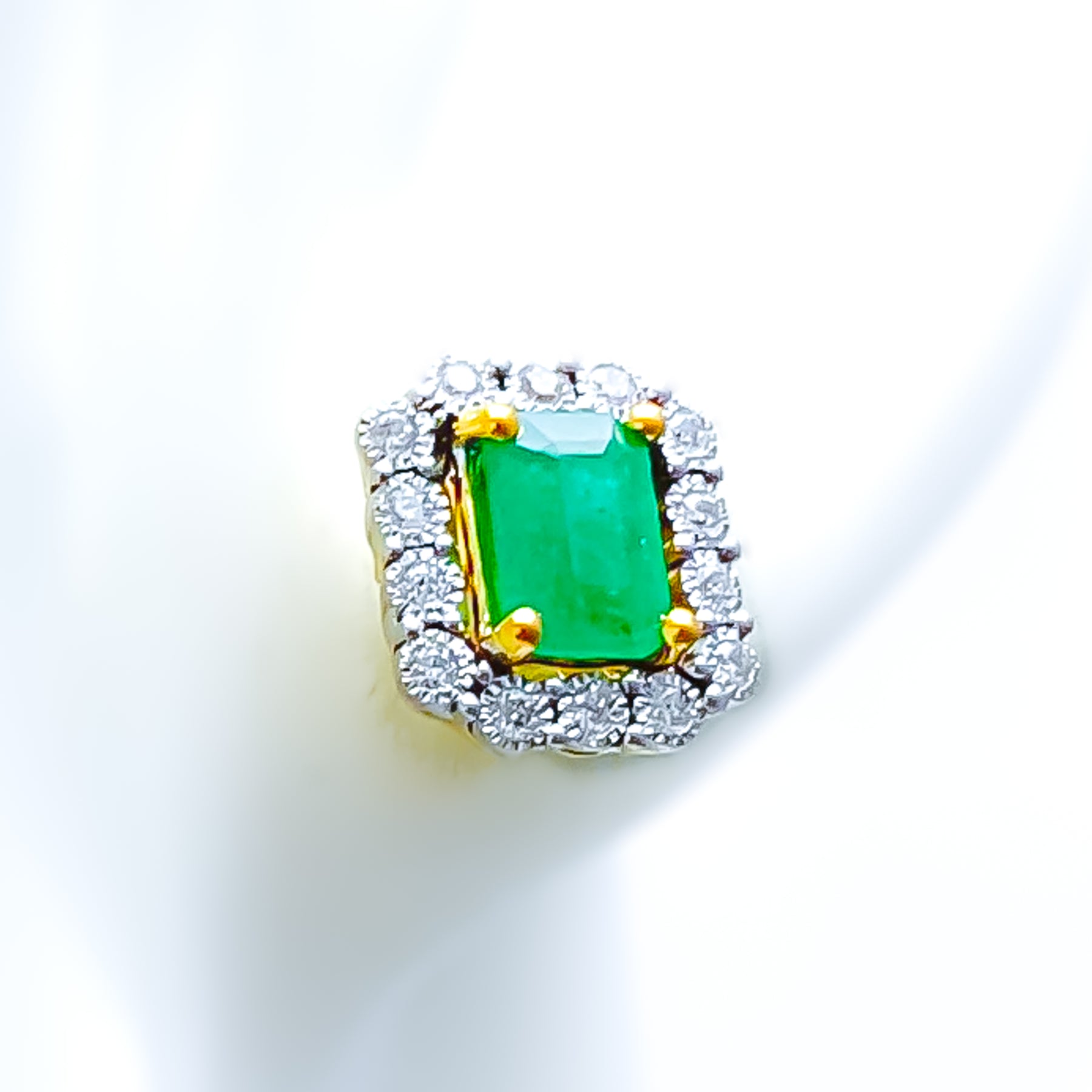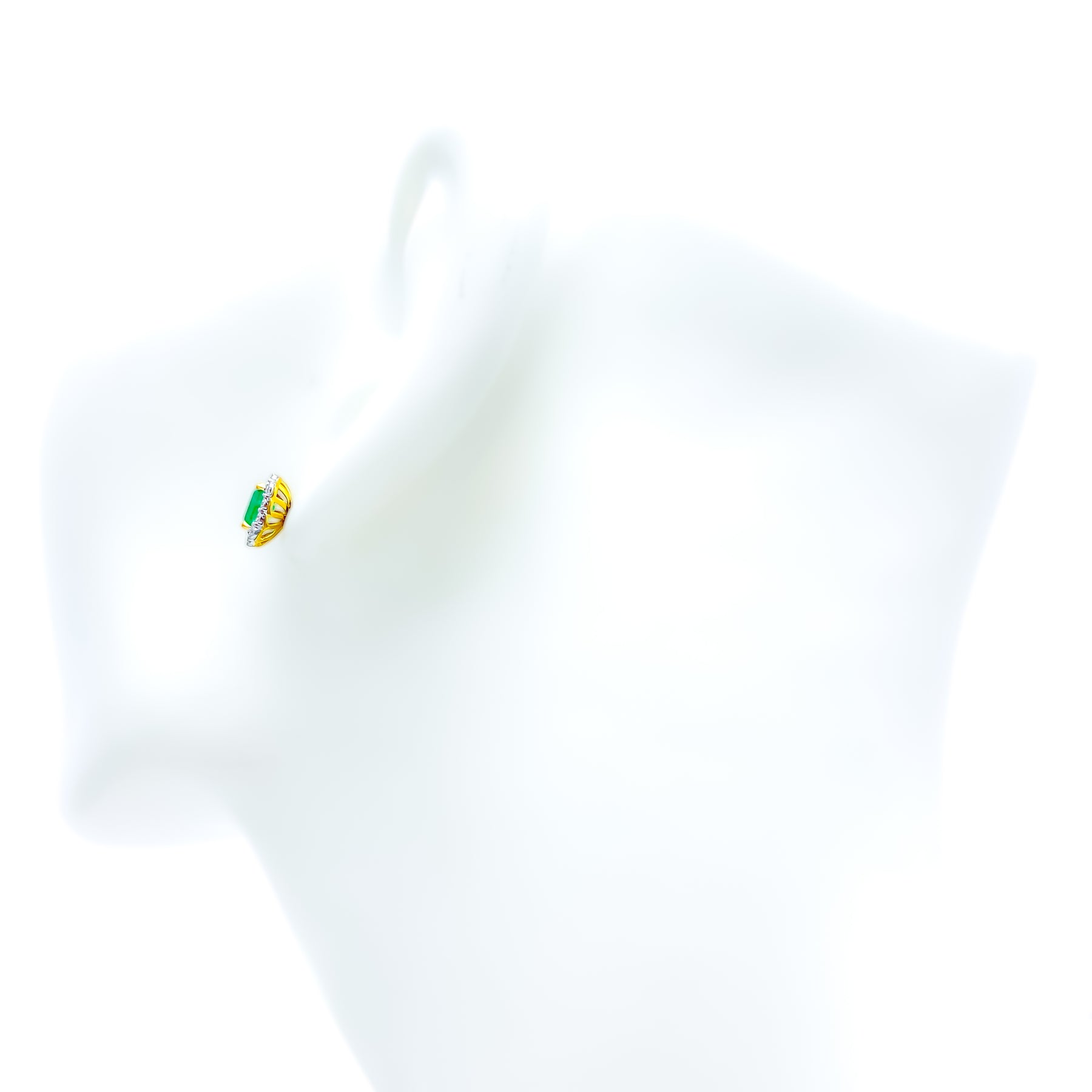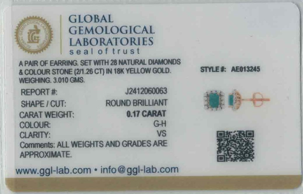 Sculpted in 18k yellow gold, these 3.01-gram earrings feature a regal design highlighted by 0.17ct of G-H color, VS clarity round brilliant diamonds. At the center, emerald-cut cultured emeralds add a rich, noble touch. Measuring 0.4 inches with screw backs, they're GGL certified and perfect for graceful sophistication.