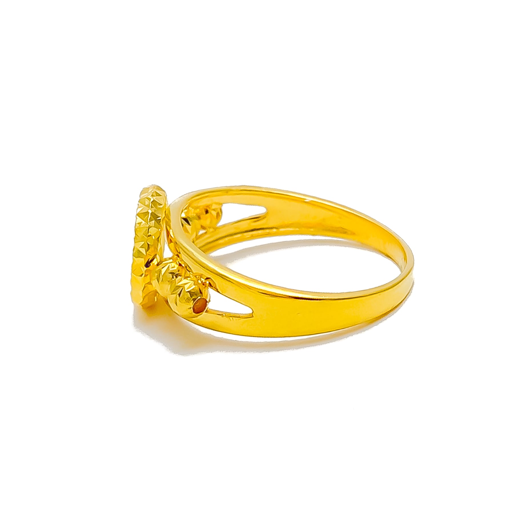 Rich in charm, this 2.7-gram ring in 21k yellow gold features a refined design that radiates regal elegance. Sized at 6.25 with sizing available, it offers a comfortable and tailored fit. Perfect for those who appreciate timeless sophistication in a graceful, everyday statement.