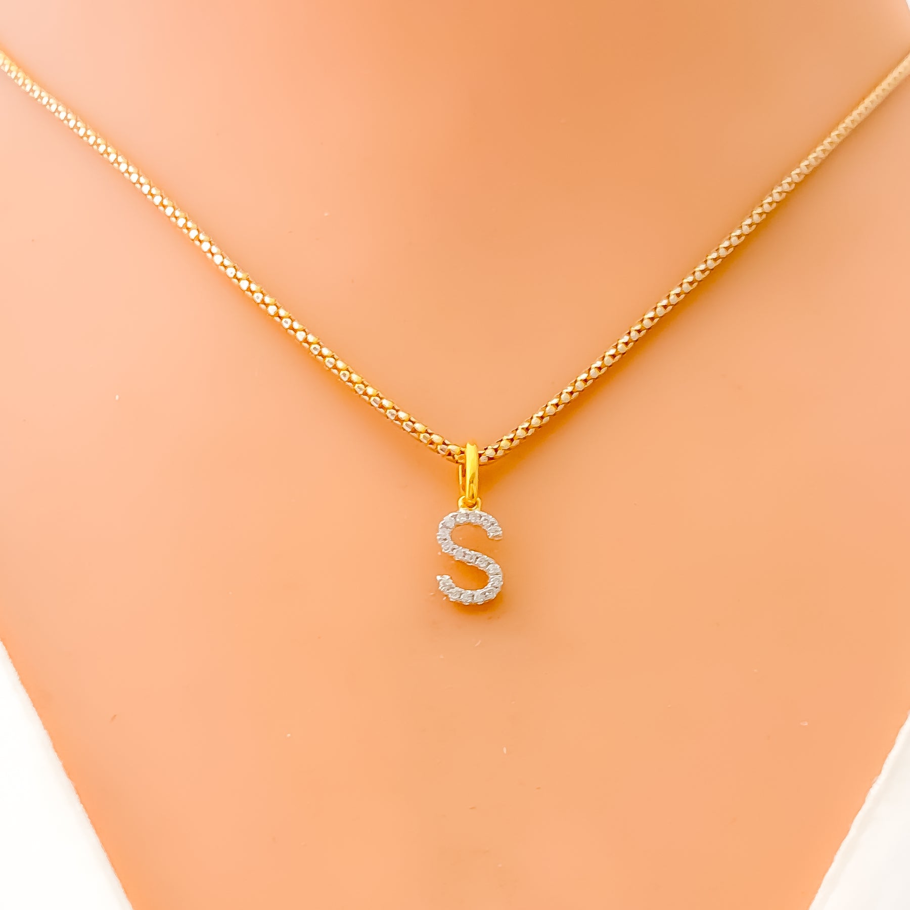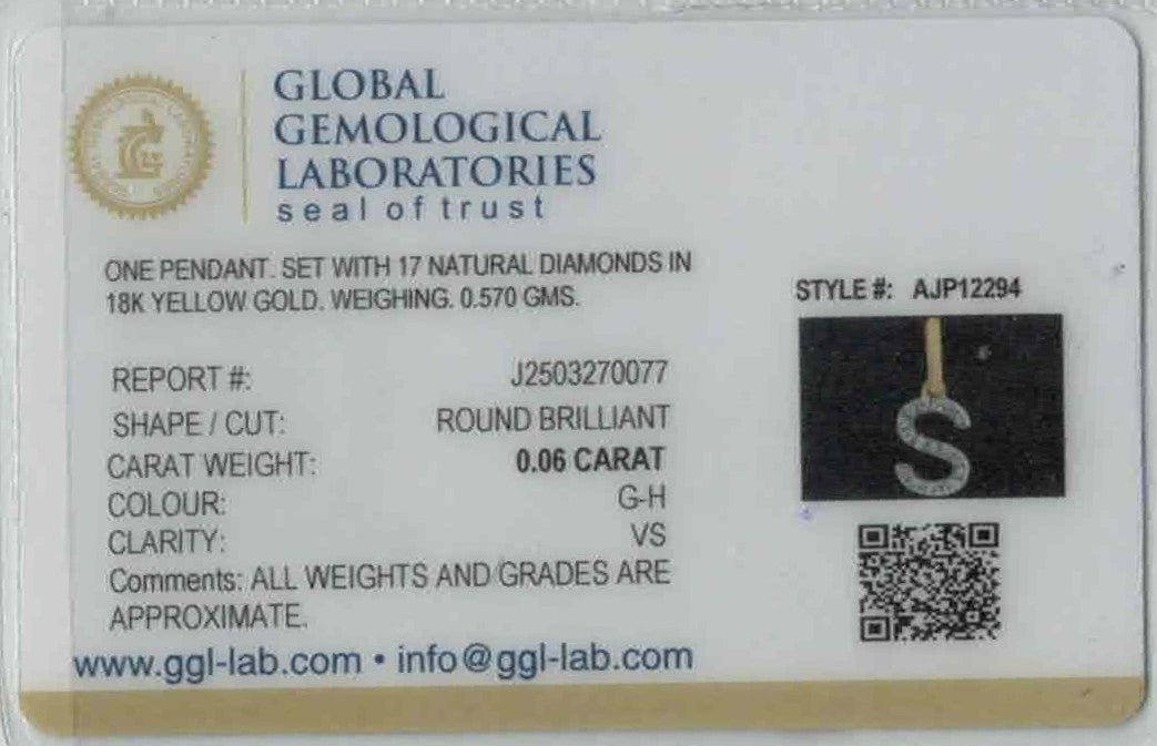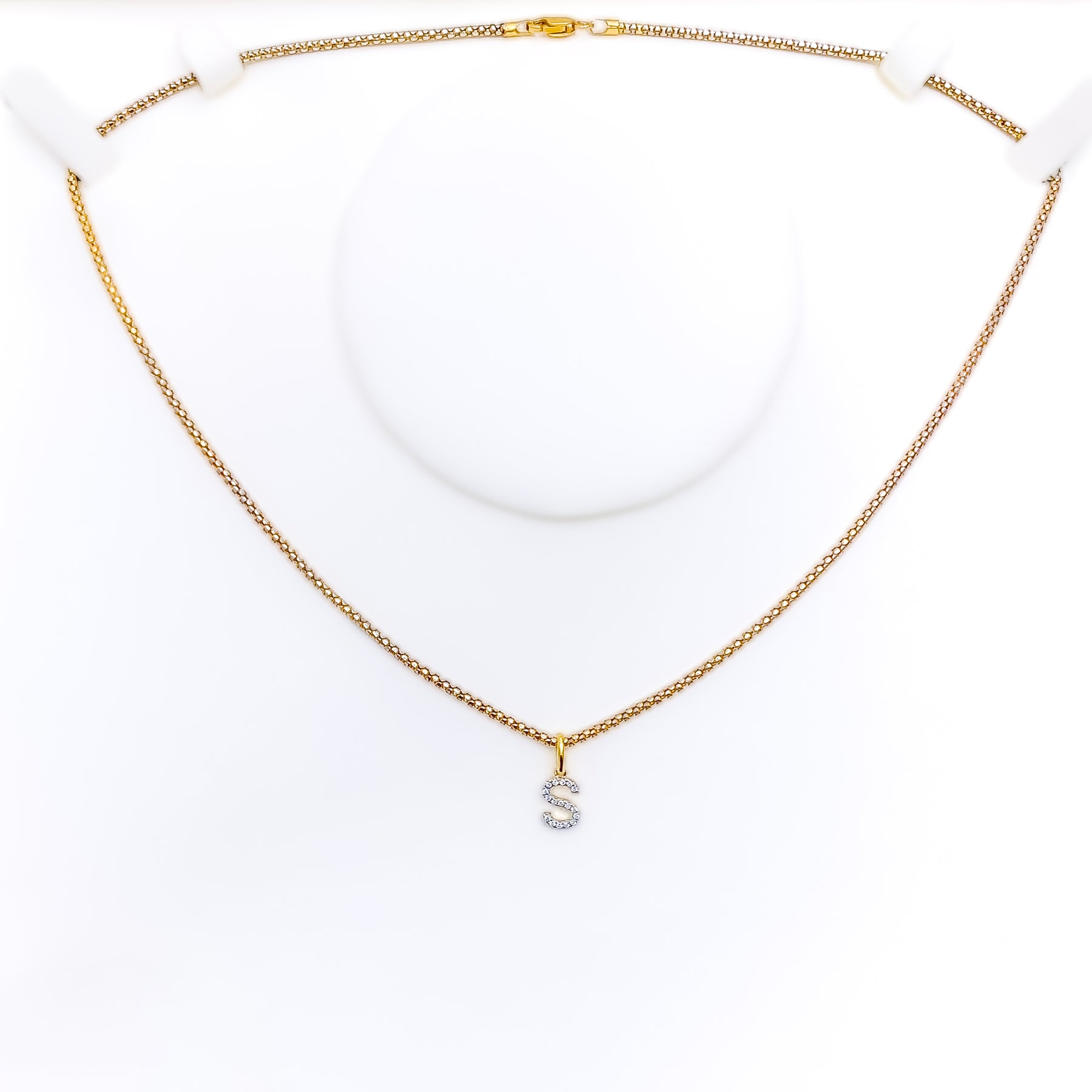 Timeless and elegant, this 18k yellow gold pendant features the letter S beautifully adorned with a 0.06ct VS-quality diamond. Weighing 0.57 grams and measuring 0.6 inches in length, it delivers a perfect balance of classic warmth and sparkling detail. The polished finish enhances its radiant charm. Chain not included, and it comes GGL certified for verified quality and authenticity.