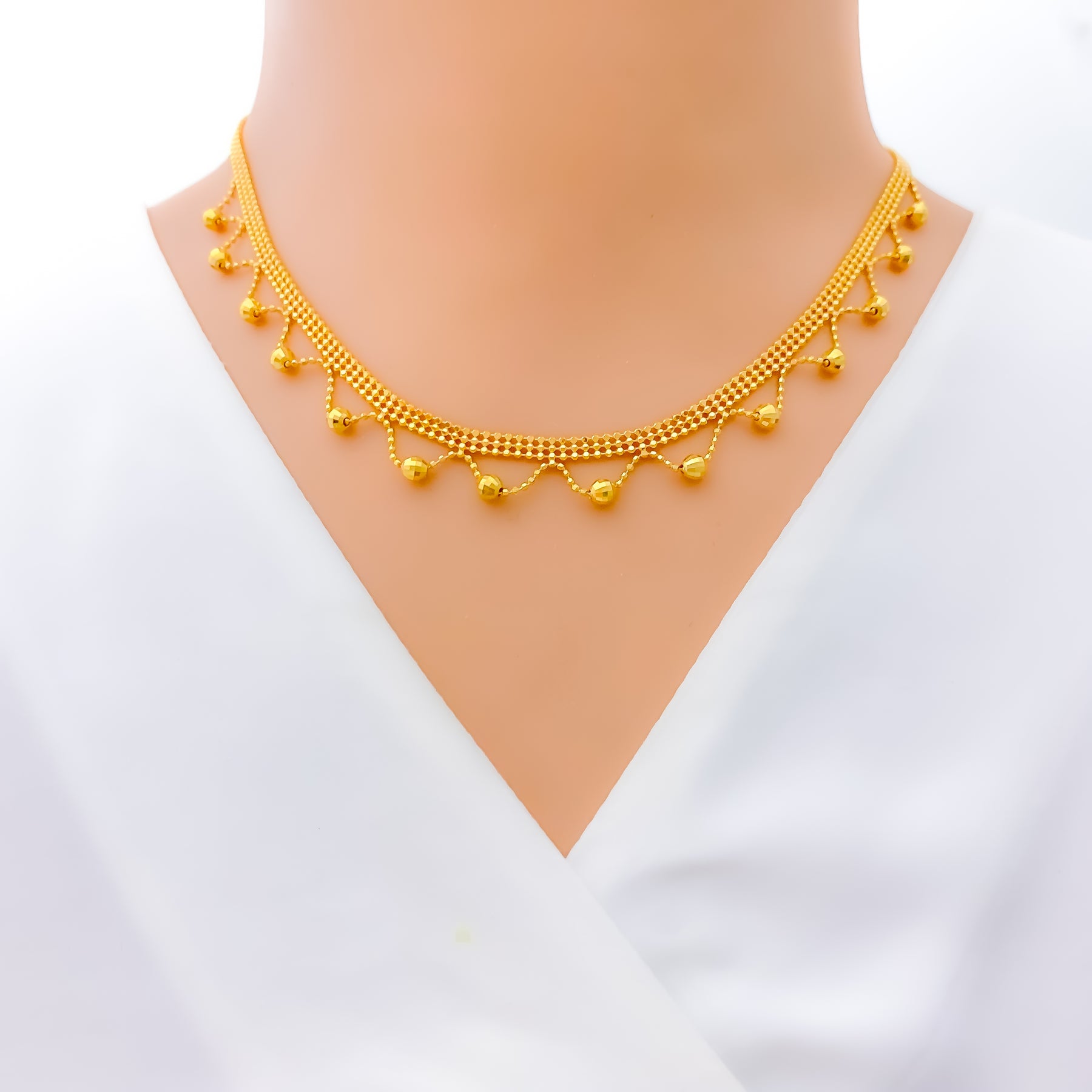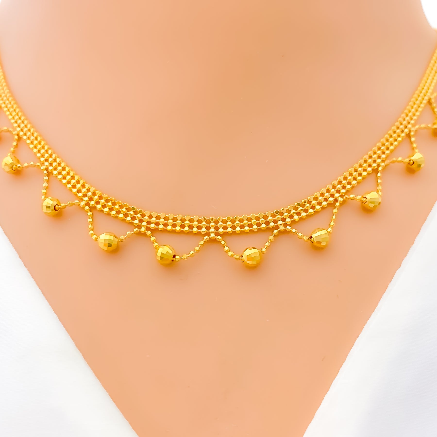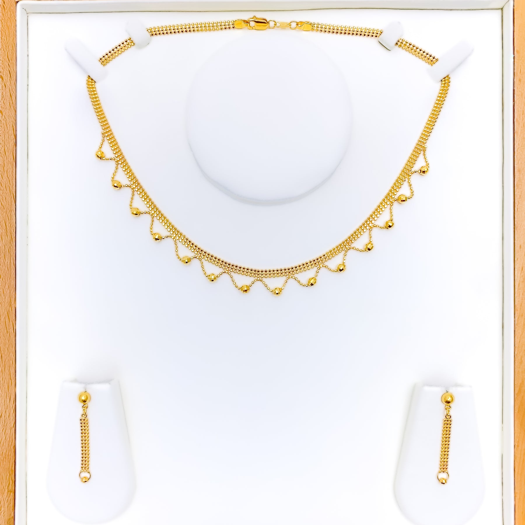 Enhance your style with this exquisite 22k yellow gold necklace set, weighing 15.6 grams. The shiny faceted bead design gracefully extends to a length of 16 inches, adding a touch of sophistication to your ensemble. The secure lobster lock ensures both style and peace of mind. The set includes matching 1.5-inch earrings with convenient push-back posts for effortless wear.