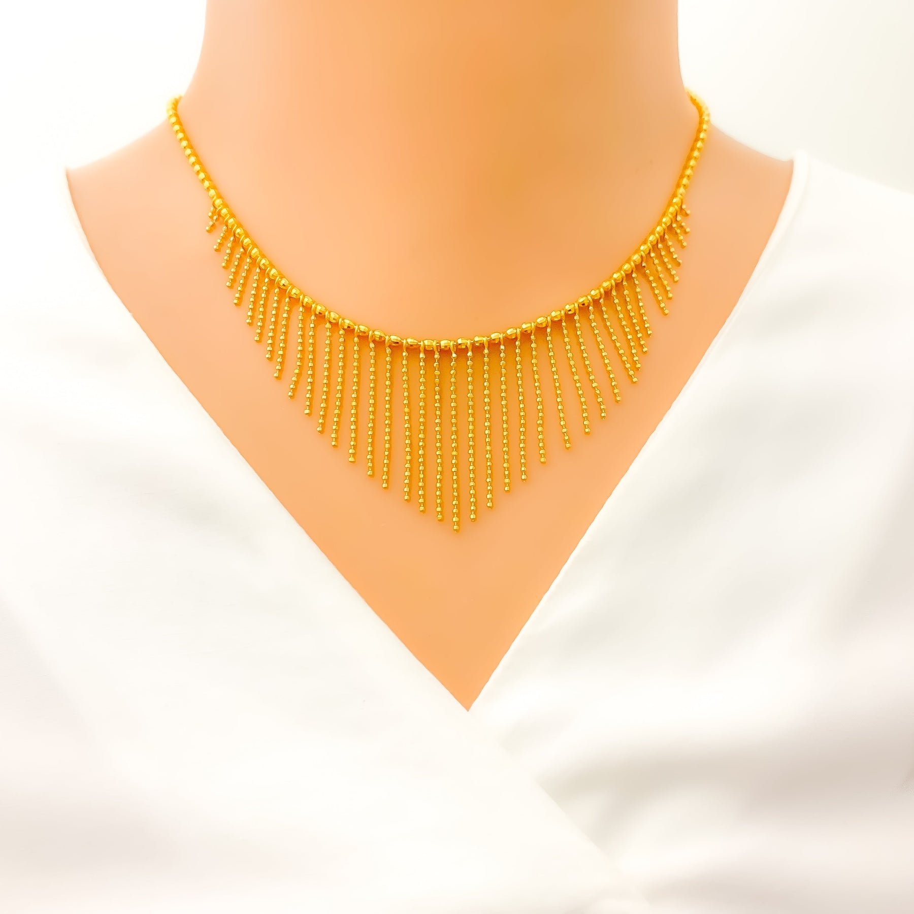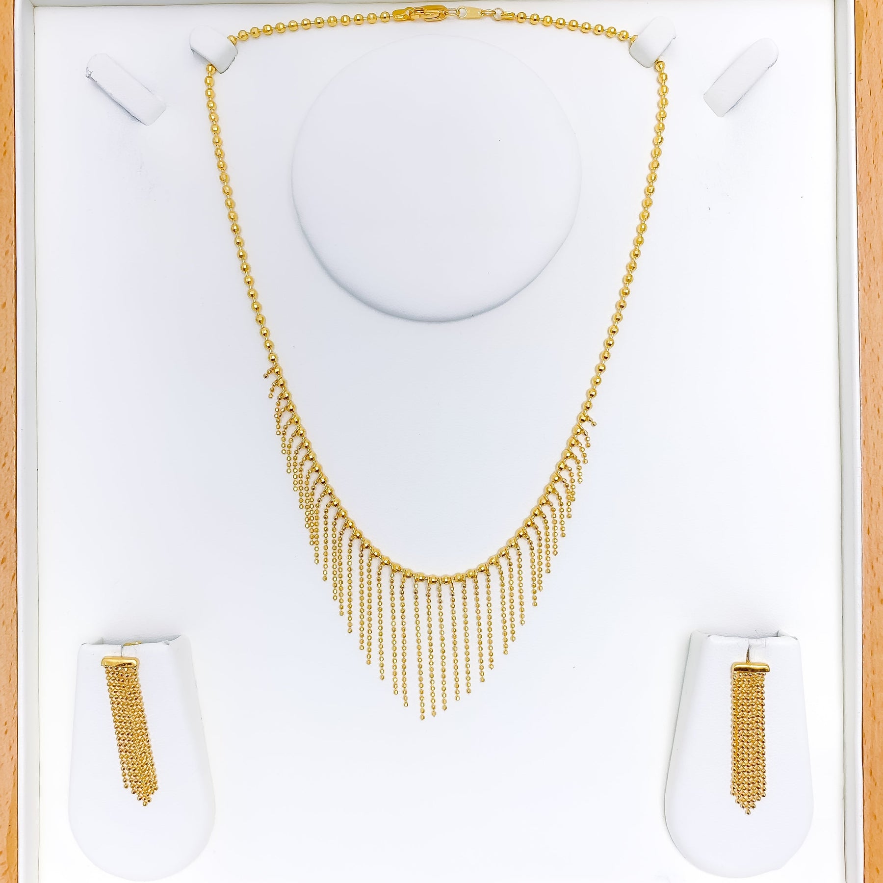 Elegance meets luxury in this stunning 22k yellow gold necklace set, with an impressive weight of 21.7 grams. The sleek design gracefully extends to a length of 16.25 inches, creating a captivating and refined look. The secure lobster lock ensures both style and peace of mind. The set includes matching 1.5-inch earrings with convenient push-back posts for easy wear. Elevate your ensemble with this exquisite jewelry set, radiating opulence and timeless beauty.
