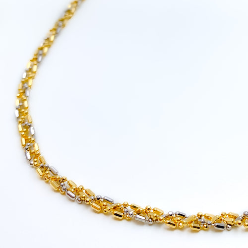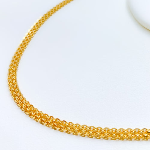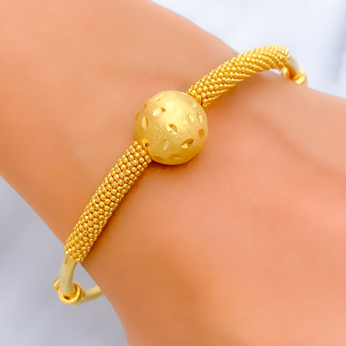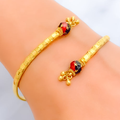 Inspired by natural elegance, this 22k gold bangle weighs 14.5 grams and features intricate leaf accents brought to life with yellow, white, and rose gold finishes. Sized at 2.6 with a 2.35" opening, it offers a graceful fit that combines comfort with charm. The polished, multi-tone design adds shimmering dimension, making it an eye-catching piece for any occasion. Ideal for those who appreciate delicate detail with radiant shine, this bangle beautifully balances nature-inspired motifs and refined sophistication.